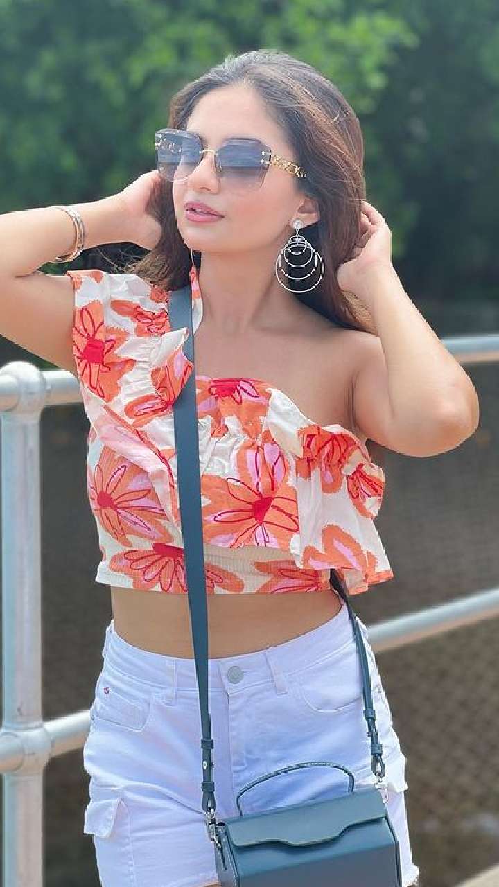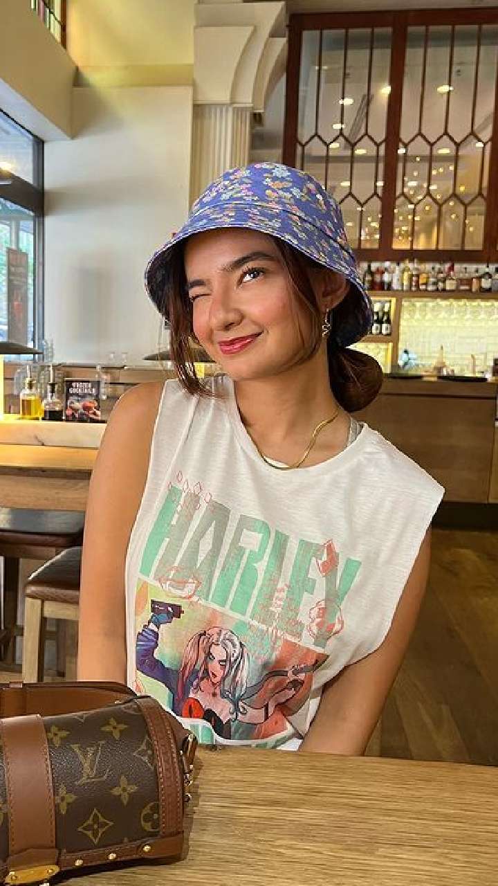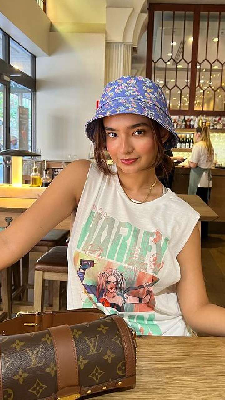 अनुष्का सेन शॉर्ट टी-शर्ट और कैप पहने हुए काफी स्टाइलिश लग रही हैं।