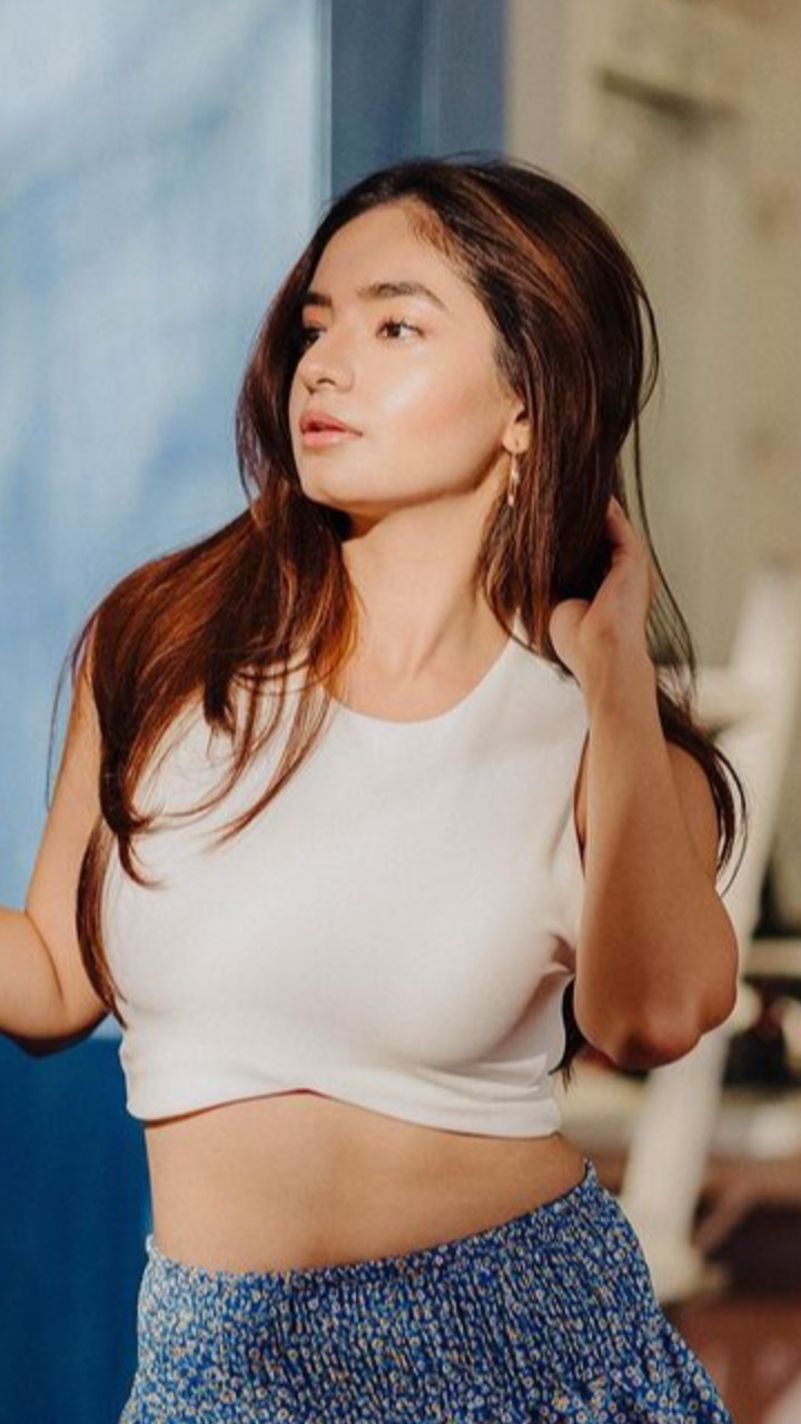 अनुष्का सेन व्हाइट क्रॉप टॉप और स्कर्ट में काफी हॉट नजर आ रही हैं।