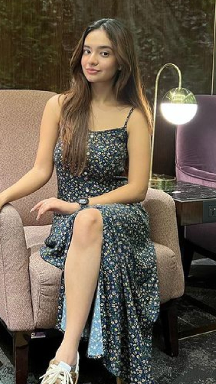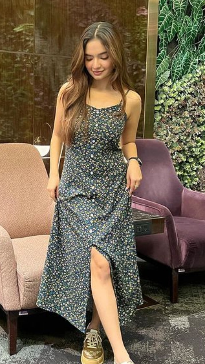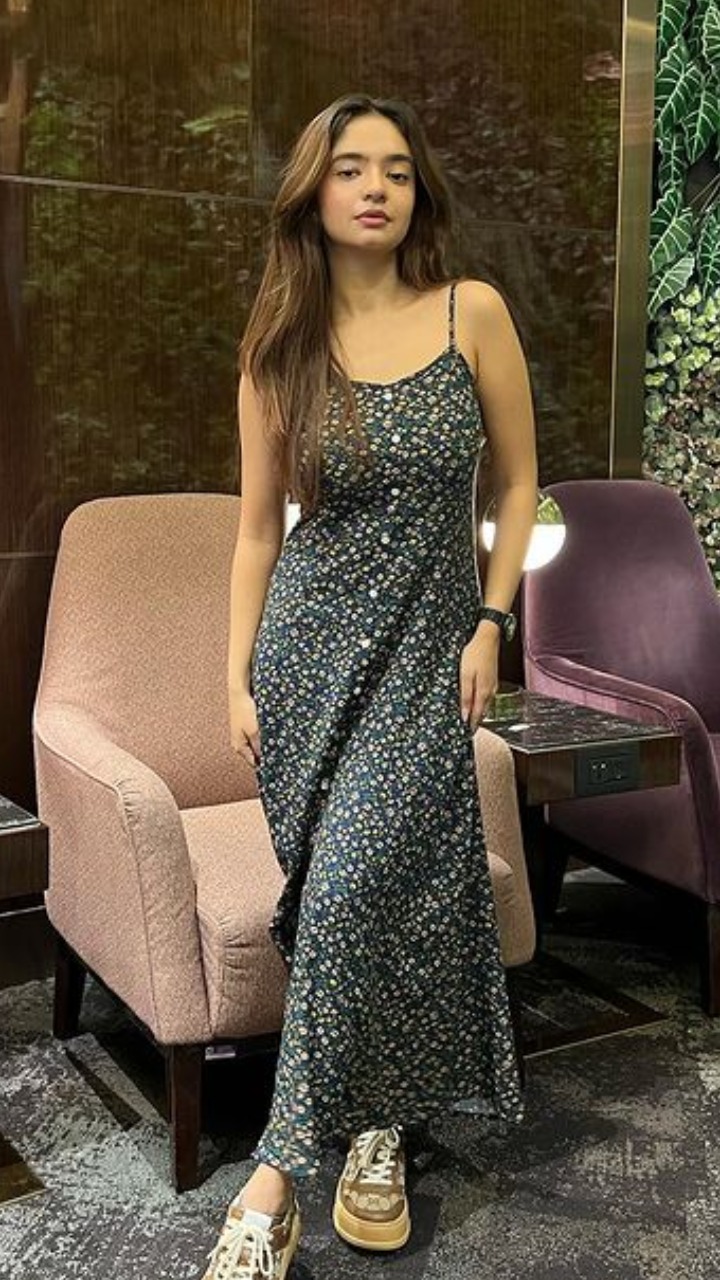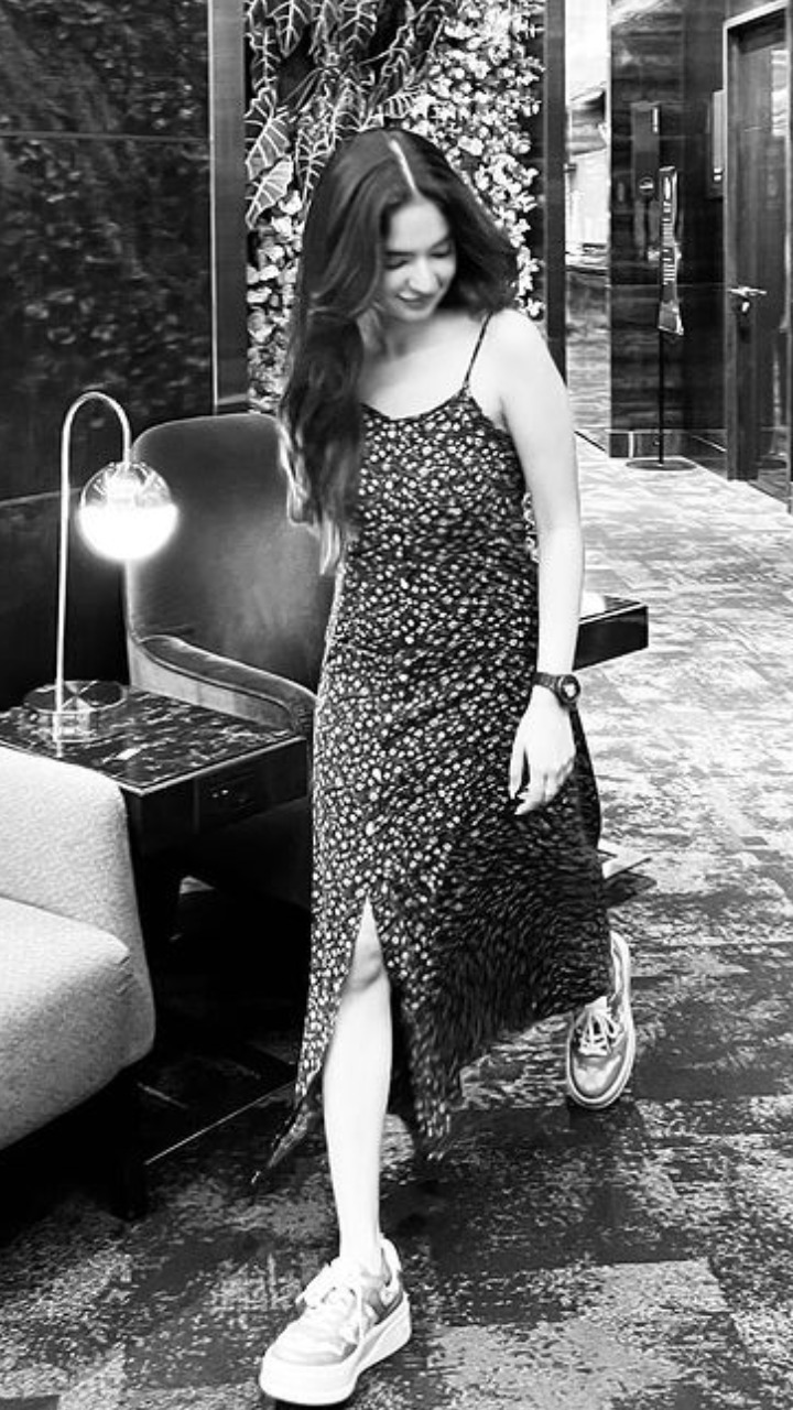 एक्ट्रेस ने इस ब्लैक स्ट्रेप वाली प्रिंटेड मिडी संग स्पोर्ट्स शूज कैरी किये हैं।