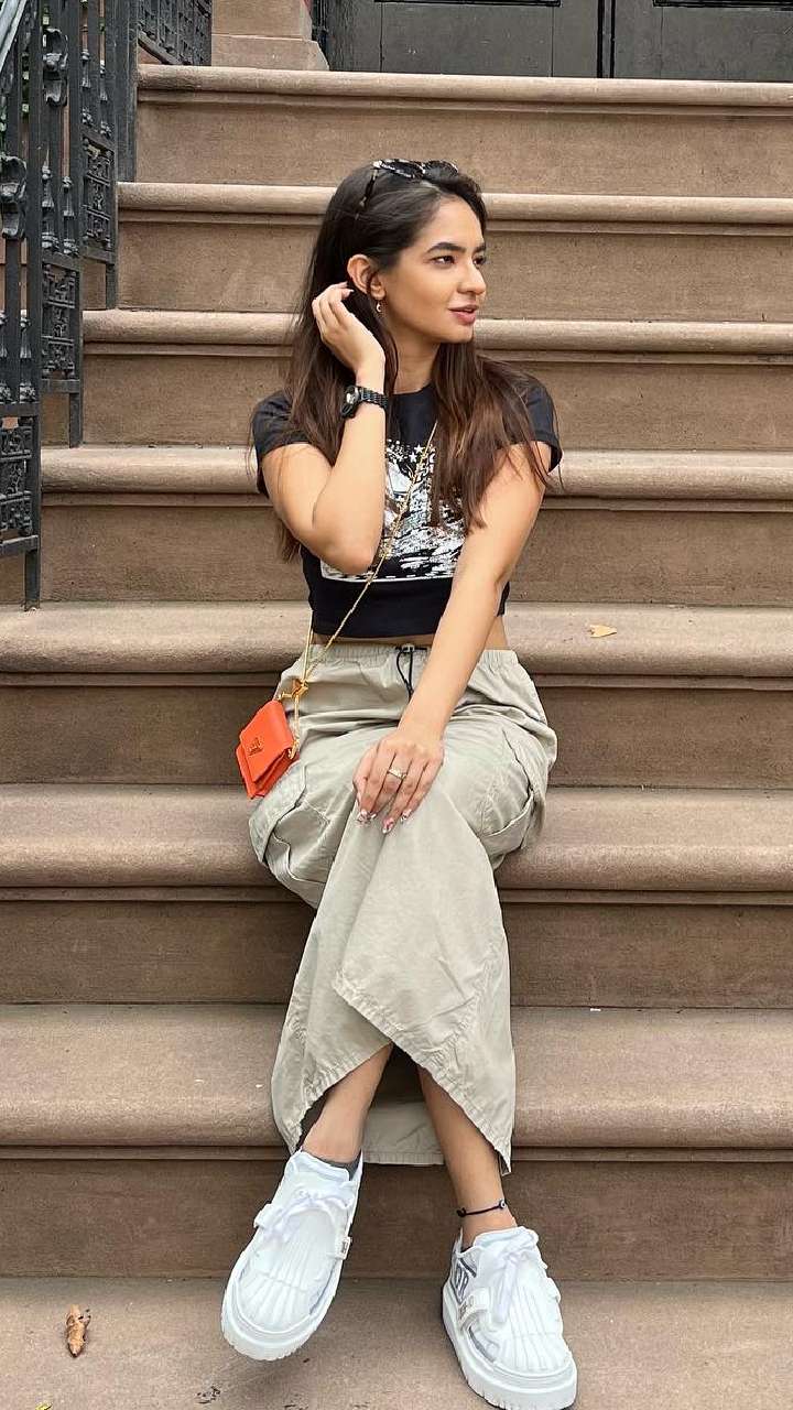 अनुष्का ने न्यूयॉर्क से मिनी स्कर्ट, क्रॉप टॉप में अपना ये लेटेस्ट लुक इंस्टाग्राम पर शेयर किया है। इसके साथ एक्ट्रेस ने व्हाइट कलर का लग्जरी बैग कैरी किया है।