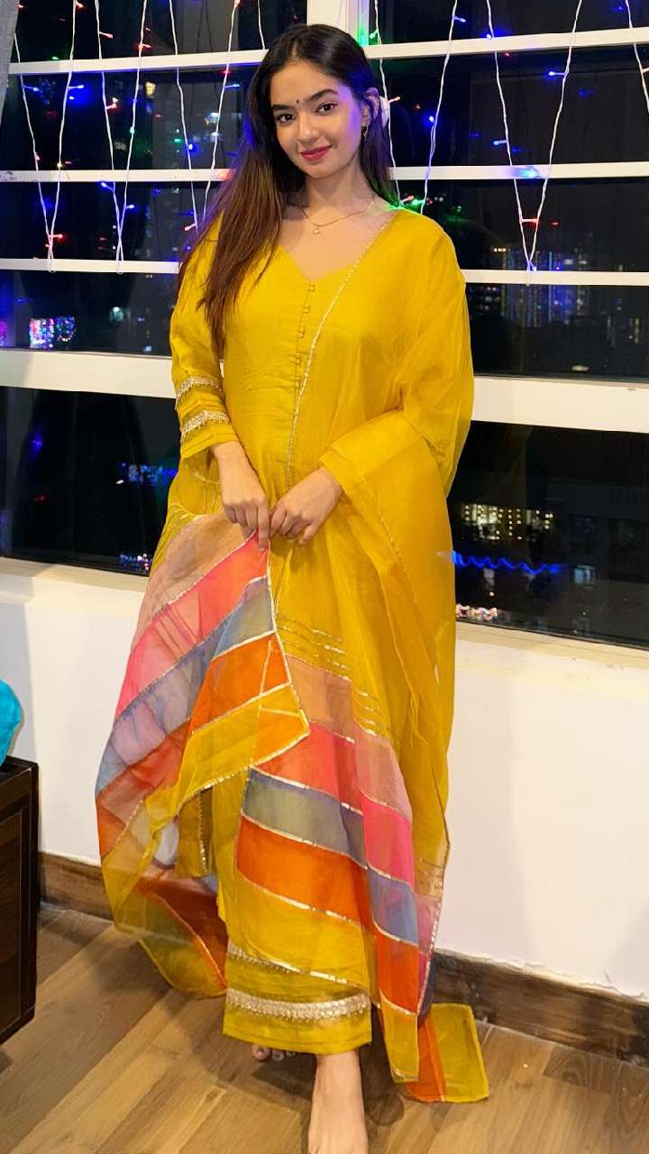 आजकल ऑर्गेंजा सूट भी काफी चलन में हैं। अनुष्का का येलो प्लेन मल्टीकलर दुपट्टा सूट हल्दी के लिए बेस्ट है।