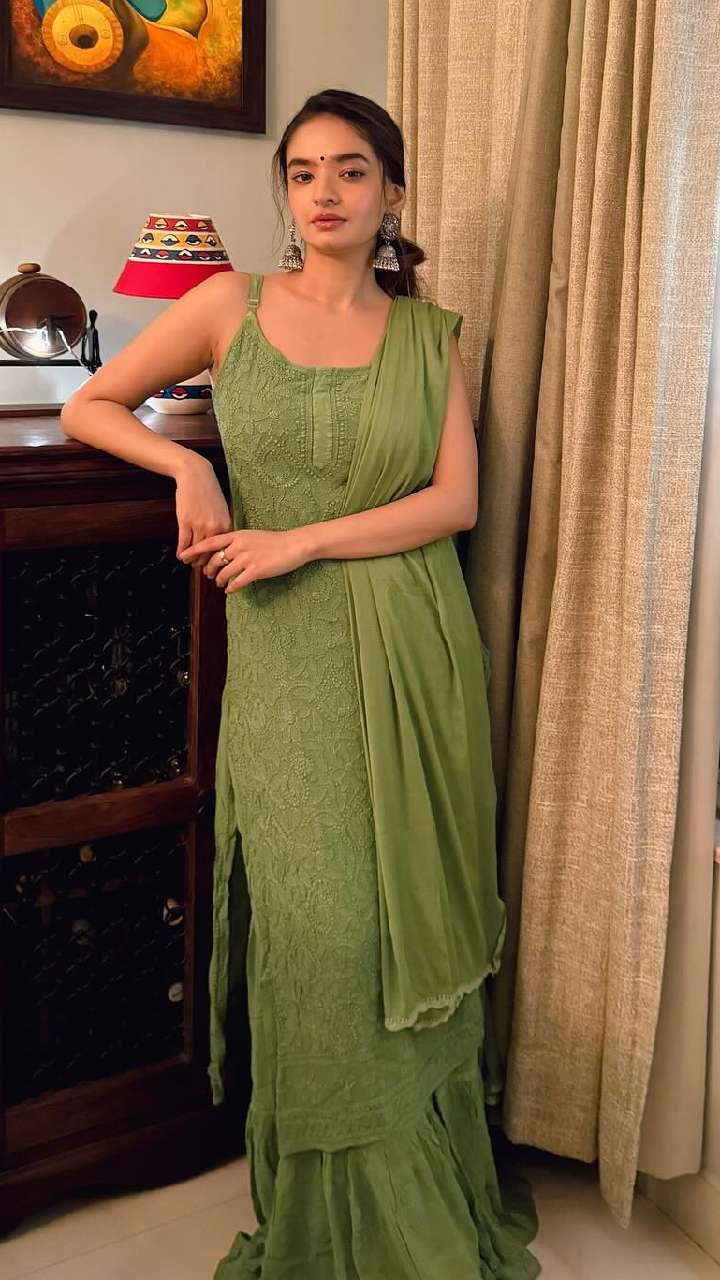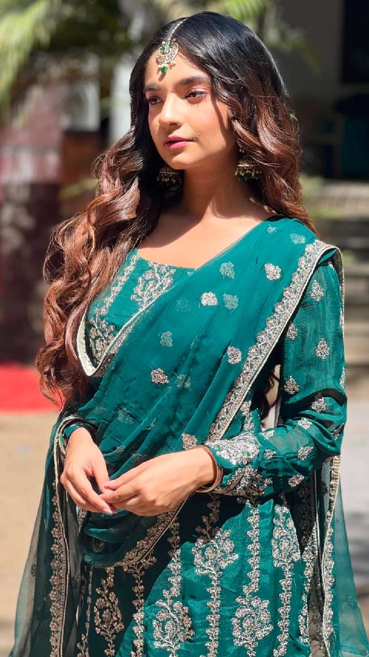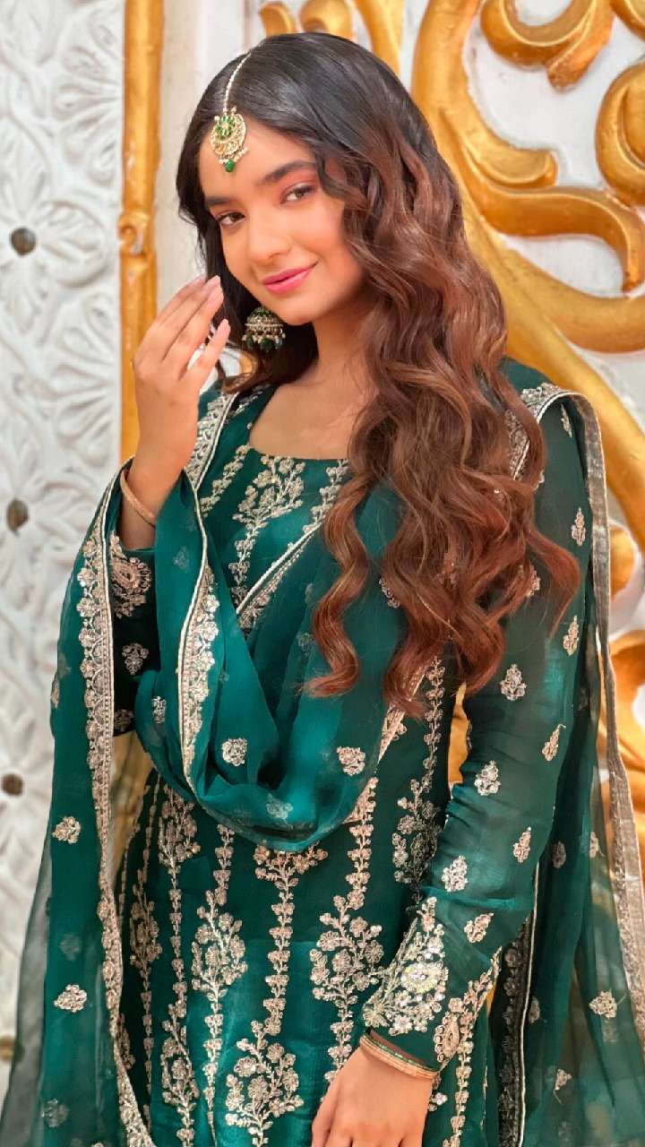 अनुष्का सेन डार्क ग्रीन कलर के हैवी जरी वर्क सिल्क सूट में बला की खूबसूरत लग रही हैं। मेहंदी में ये लुक आप कैरी कर सकती हैं।