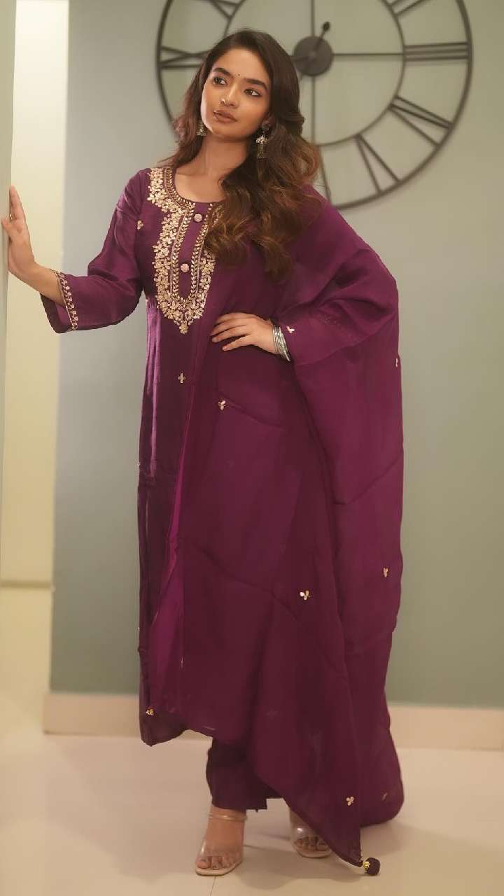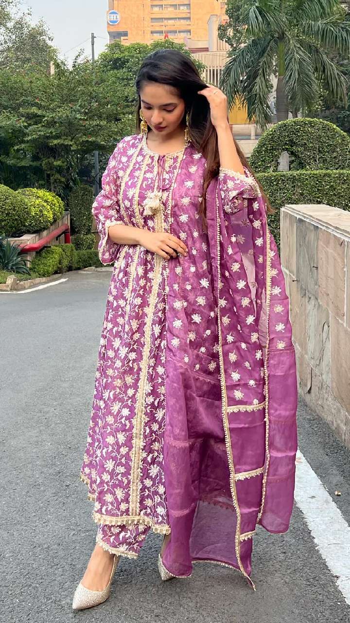संगीत नाइट में आप अनुष्का के पर्पल चिकन वर्क सिल्क अनारकली सूट को पहनकर पार्टी में महफिल लूट सकती हैं।