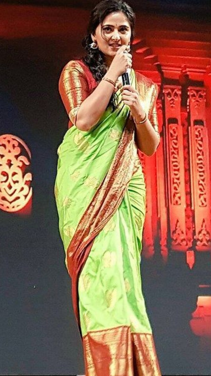 ग्रीन कलर की इस साड़ी में अनुष्का शेट्टी का यह लुक शानदार है। आप भी उनके ये क्लासी लुक ट्राई कर सकती हैं।