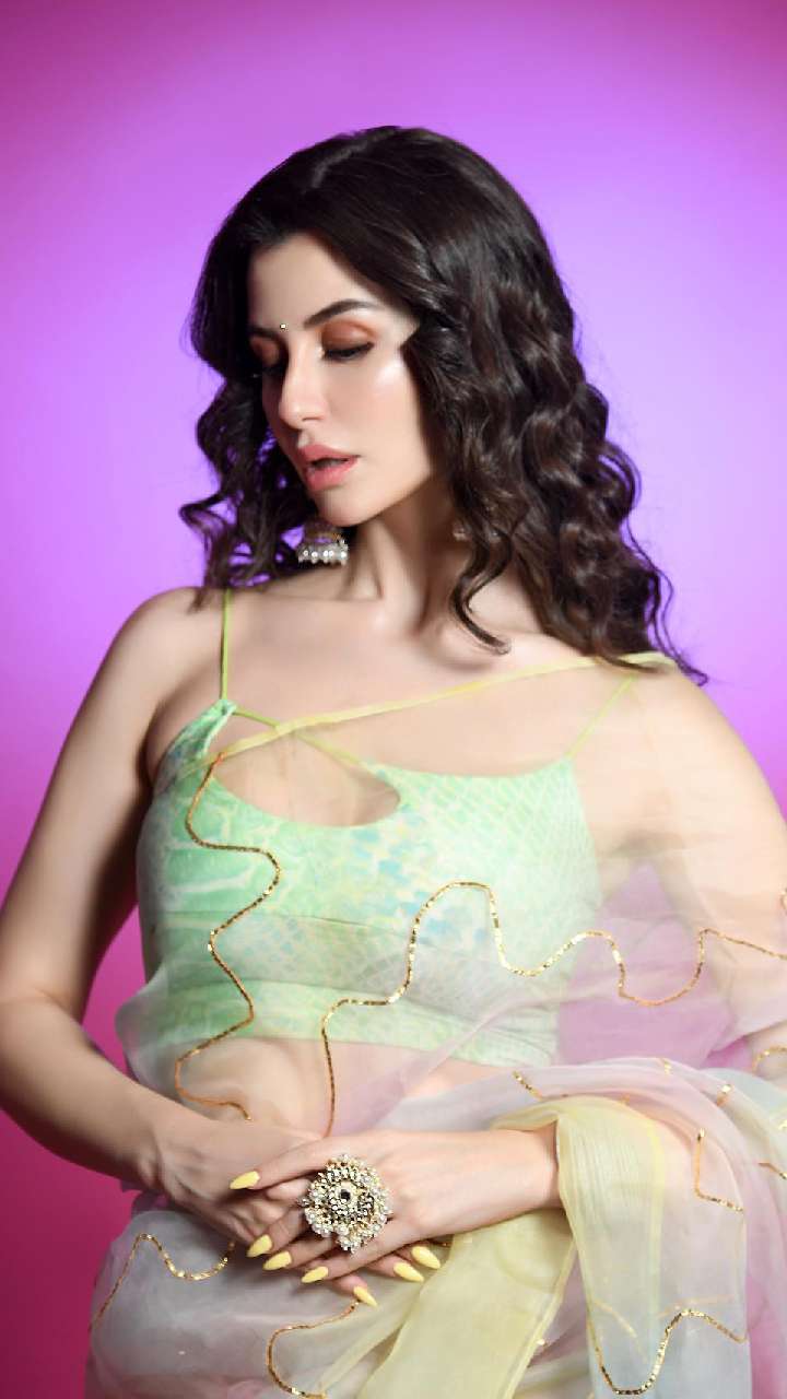 इस लाइट कलर की ऑर्गेंजा साड़ी हाफ कर्ल हेयर और क्रिस क्रॉस ब्लाउज में डीवा कहर ढहा रही हैं।