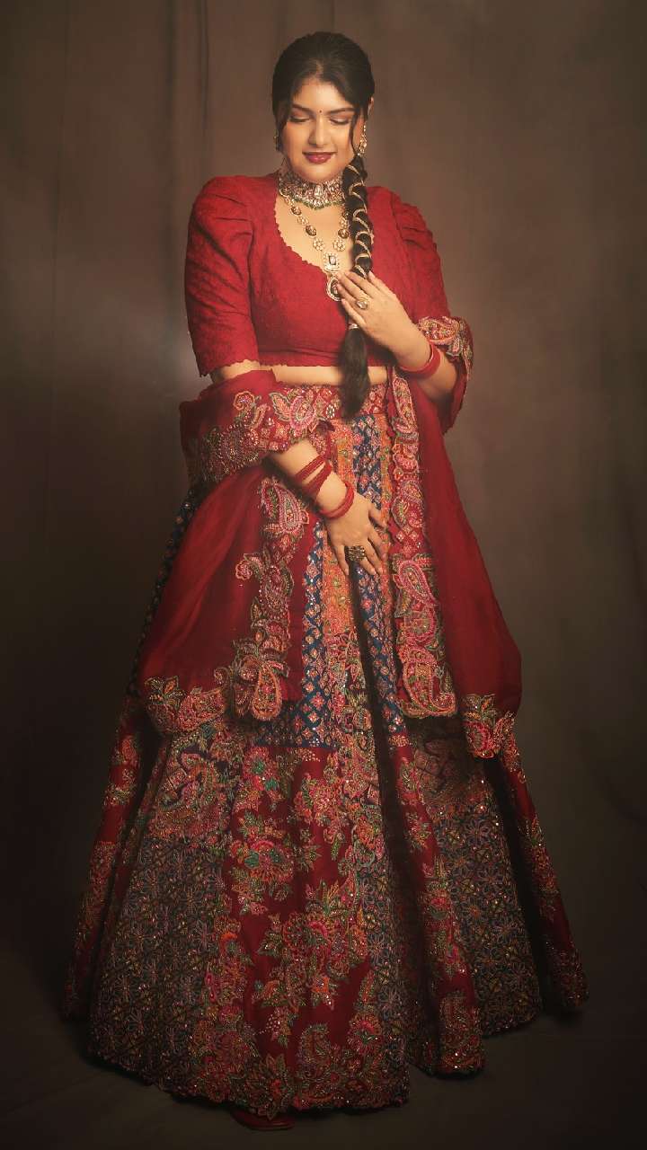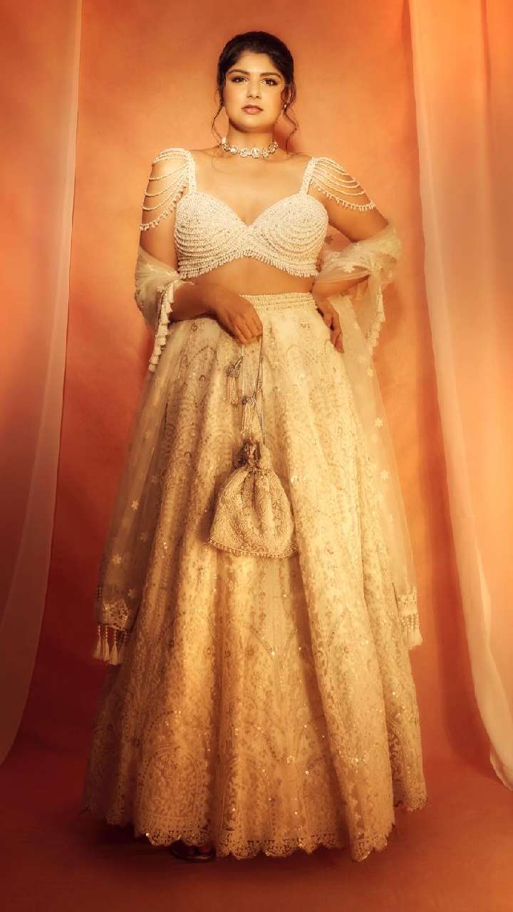नई दुल्हन सावन के दौरान ससुराल में ब्यूटीफुल दिखने के लिए अंशुला कपूर जैसा एंब्रॉयडरी लहंगा स्टाइल कर सकती हैं।
