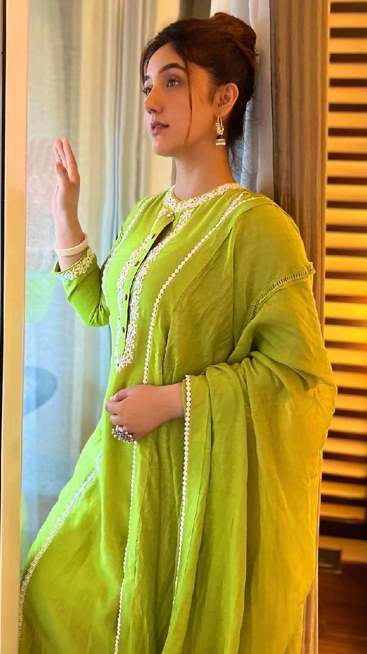 अभिनेत्री ग्रीन कलर के सिंपल सोबर व्हाइट लेस वाले पेंट सूट में गॉर्जियस लग रही हैं। यदि यंग गर्ल एलिगेंट लुक चाहती हैं तो ये परफेक्ट सूट है।