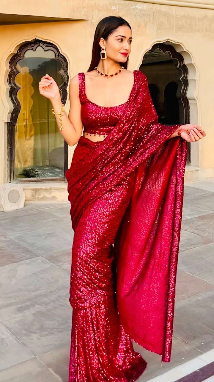 इस रेड कलर की शिमरी साड़ी कट स्लीव्स ब्लाउज में डीवा बेहद बोल्ड नजर आ रही हैं। आप उनके इस लुक को इस वेडिंग सीजन में कॉपी कर सकती हैं।