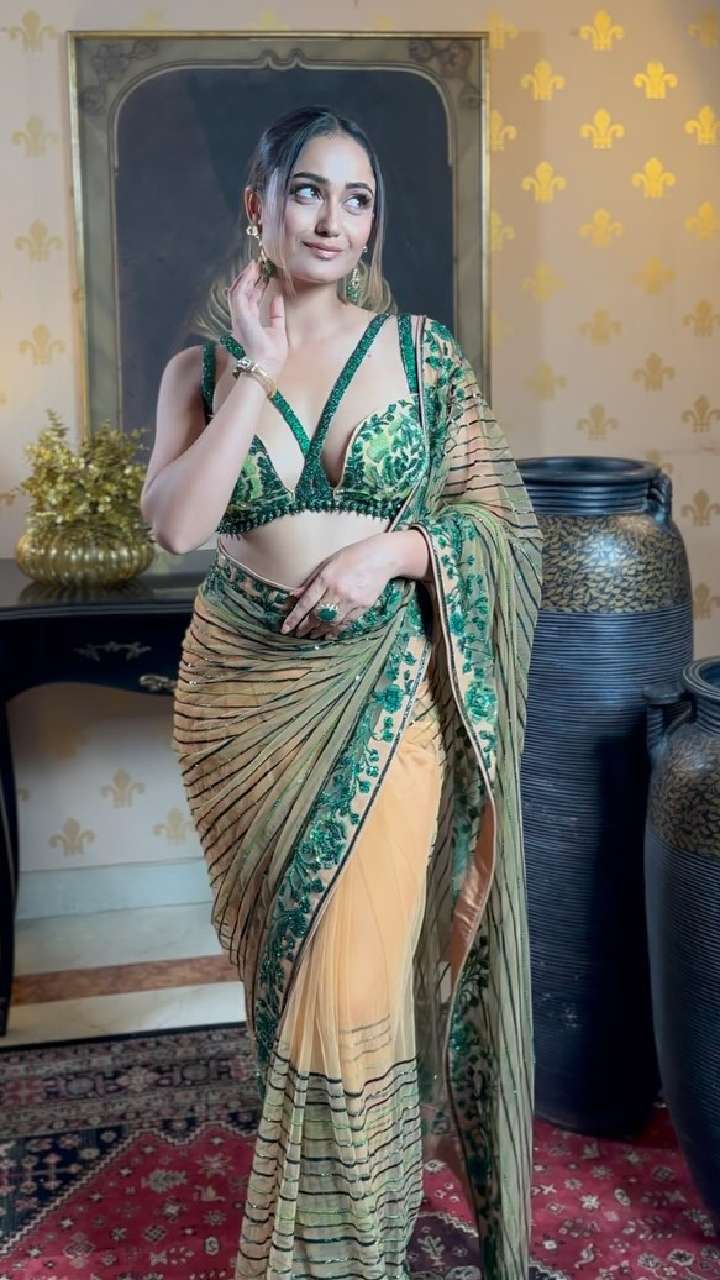 त्रिधा इस ग्रीन और पीच कलर साड़ी विद डीपनैक ब्लाउज में बेहद हॉट लग रही हैं। आप भी इस लुक को कॉपी कर अपने लुक में जान डाल सकती हैं।