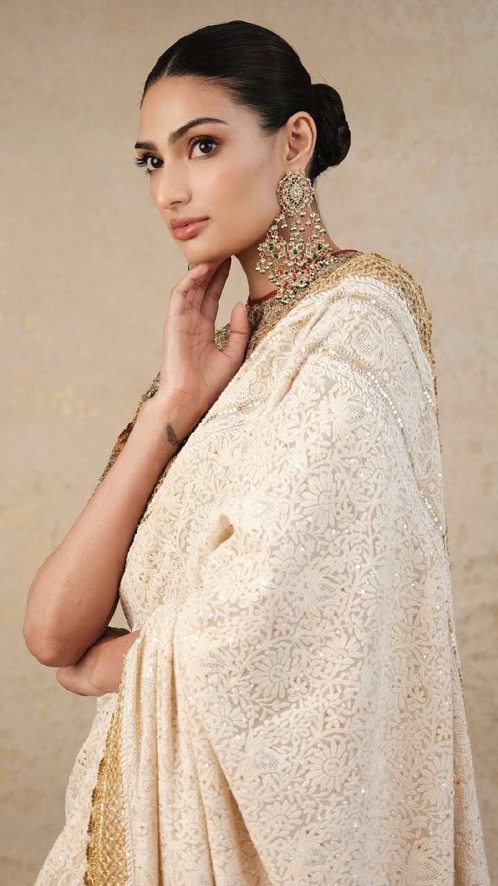लंबे और पतले चेहरे पर इस तरह के लंबे इयररिंग्स बहुत अच्छे लगते हैं। अथिया ने डायमंड और स्टोन वर्क हैंगिंग इयररिंग्स कैरी किया है, जो उनके साड़ी लुक को क्लासी बना रहा है।