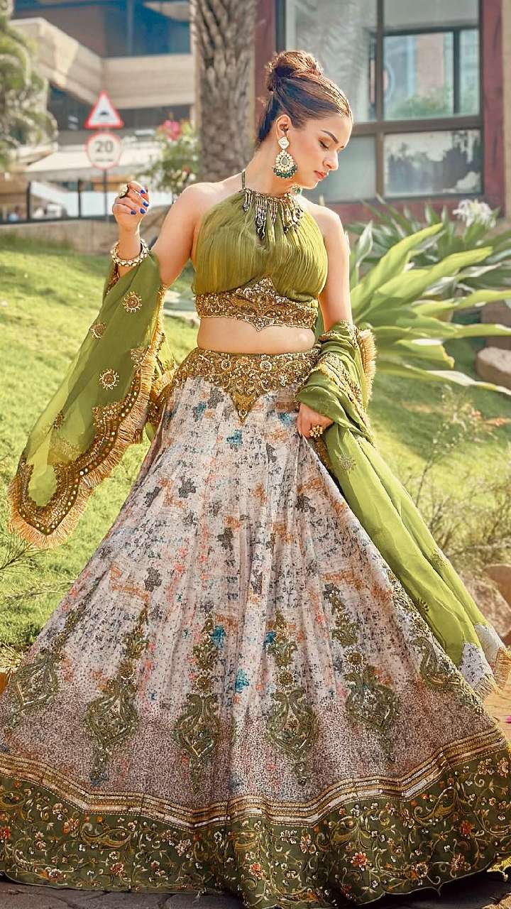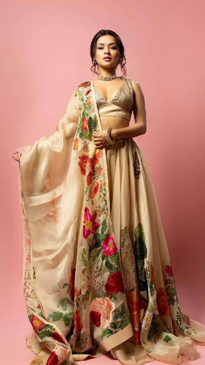 अभिनेत्री का लाइट कलर फ्लोरल लहंगा डीपनैक चोली चोकर नेकपीस आपके लुक को और ज्यादा स्टाइलिश बना देगा।