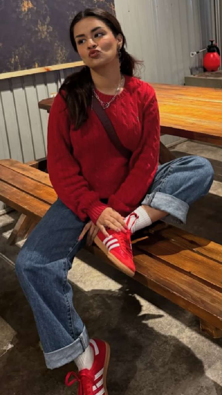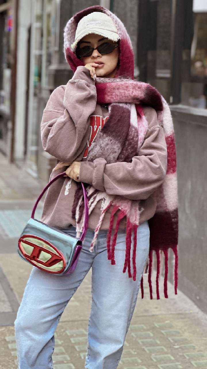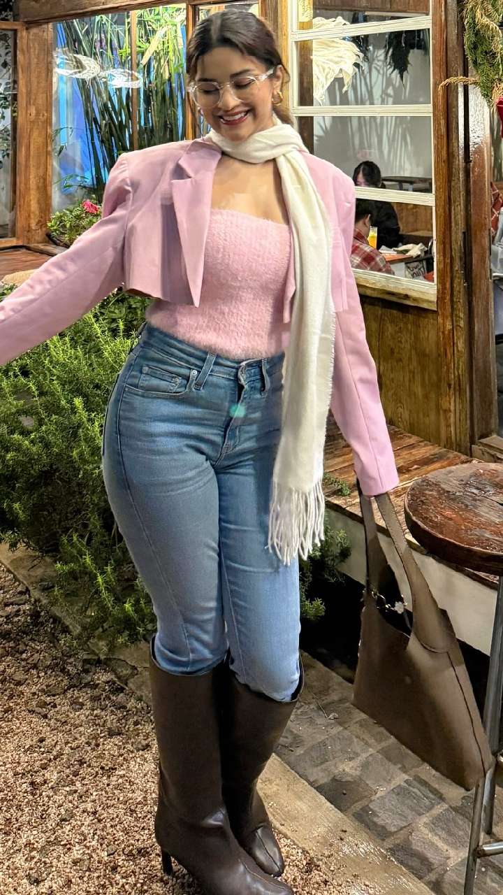 एक्ट्रेस ने ब्लू जींस के साथ पिंक ऑफ शोल्डर स्वेटर और शॉर्ट ब्लेजर स्टाइल किया हुआ हैं। उन्होंने स्कार्फ को कैरी करके अपने लुक को कंप्लीट किया है।