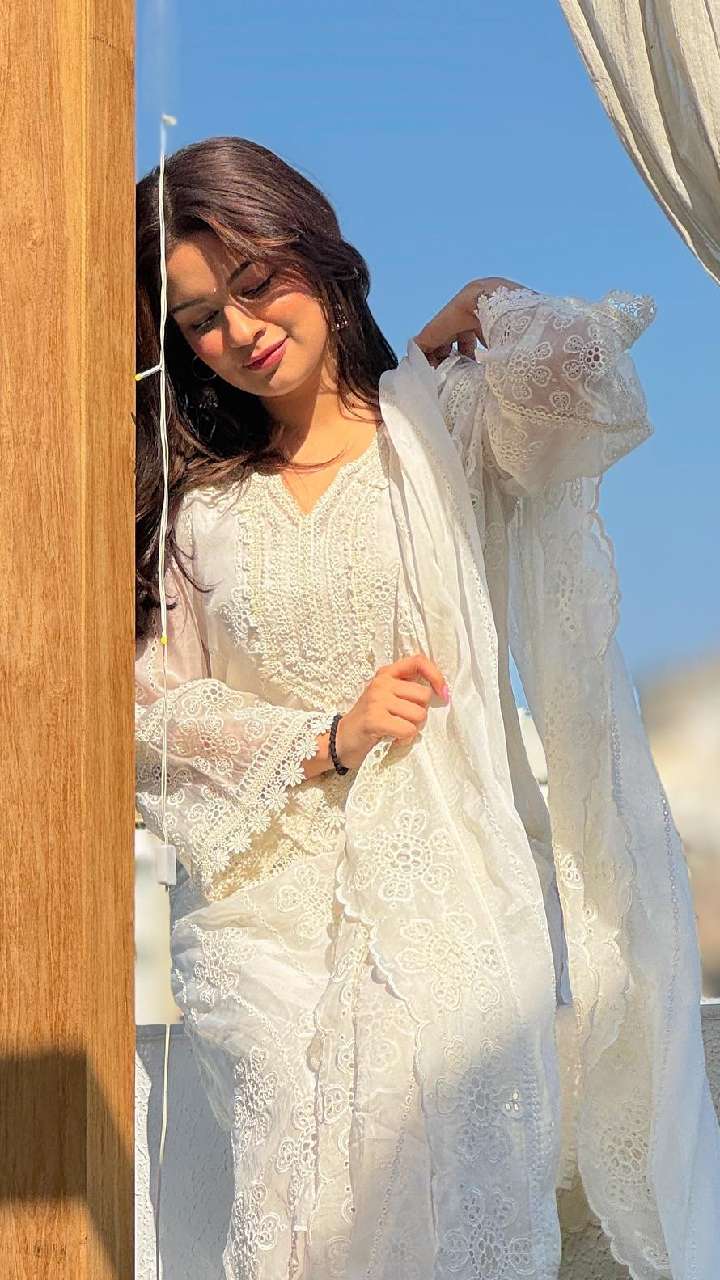 अगर आप सूट कैरी करना चाहती हैं तो आप अवनीत कौर की तरह ही व्हाइट चिकनकारी सूट लुक कैरी कर सकती हैं।