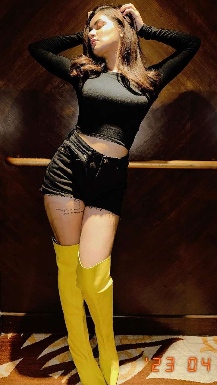 ब्लैक लवर्स के लिए अवनीत कौर का ये लुक परफेक्ट है। ब्लैक टॉप और शॉर्ट्स के साथ एक्ट्रेस ने बूट्स कैरी किए हैं।