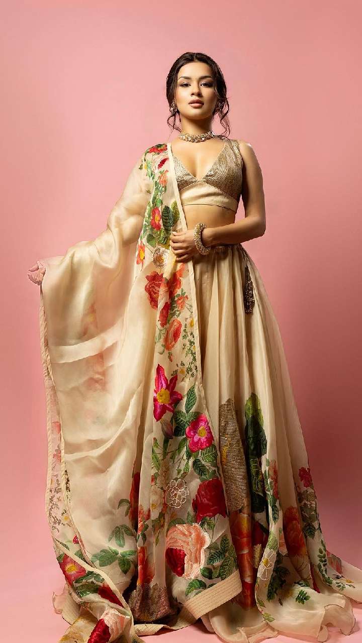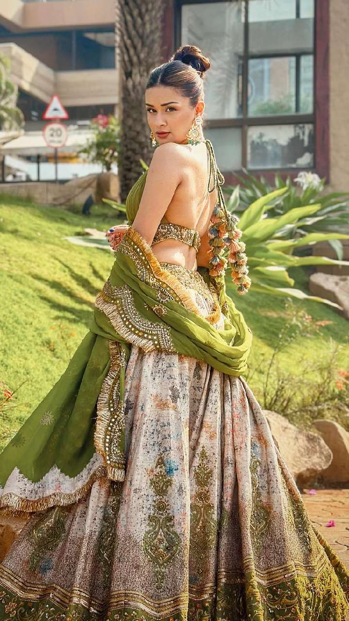 यदि आप मेहंदी फंक्शन में खुद को गॉर्जियस लुक देना चाहती हैं तो अवनीत का प्रिंटेड व्हाइट ग्रीन लहंगा बैकलेस चोली बेस्ट है। इसके साथ हैवी बन हेयर स्टाइल ट्राई कर सकती हैं।