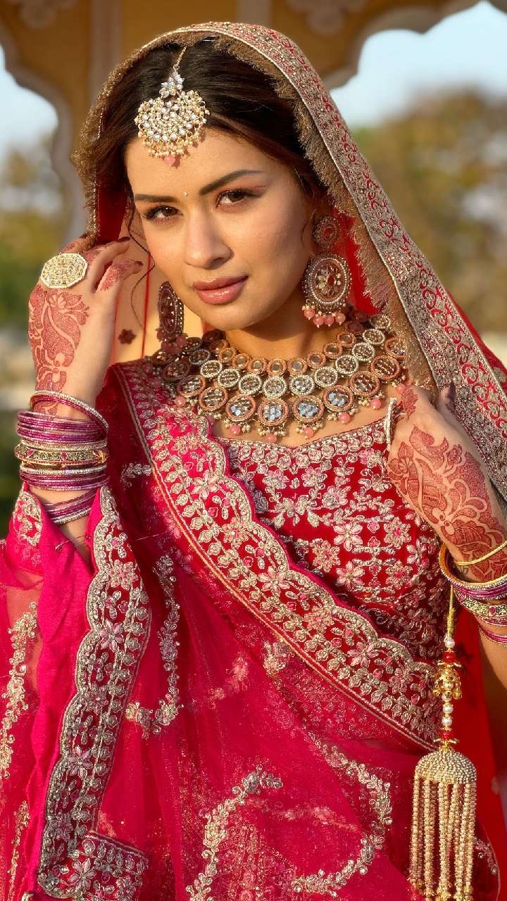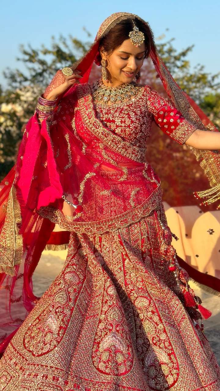 ब्राइडल अवनीत के जैसा रेड गोल्डन लेस लहंगा कुंदन ज्वैलरी ग्लॉसी मेकअप लुक को कॉपी कर सकती हैं। ये ब्राइडल के लुक में चार चांद लगा देगा।