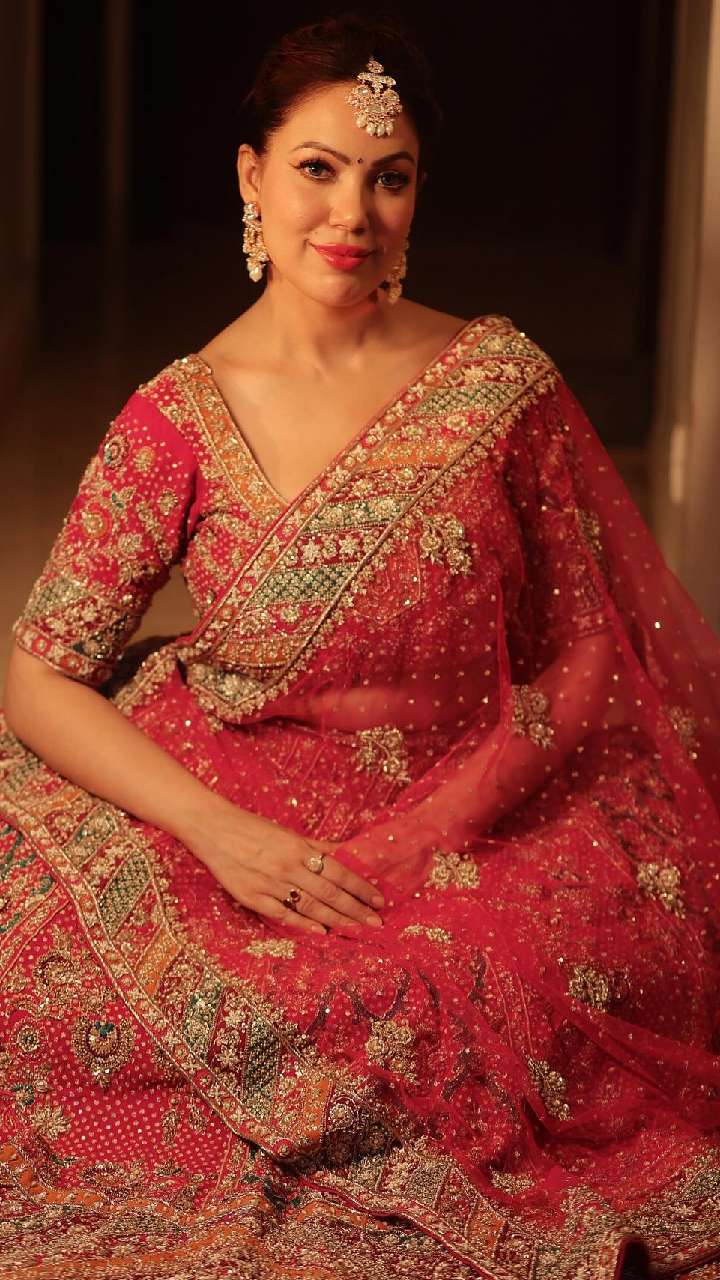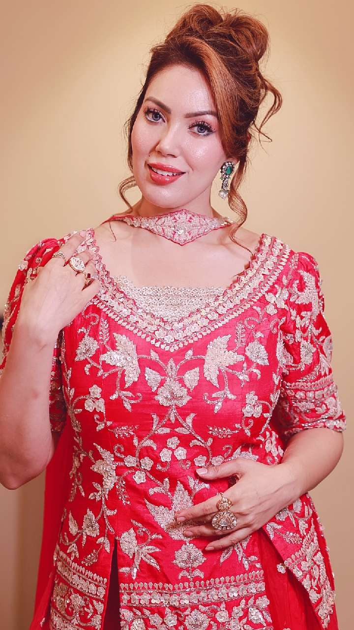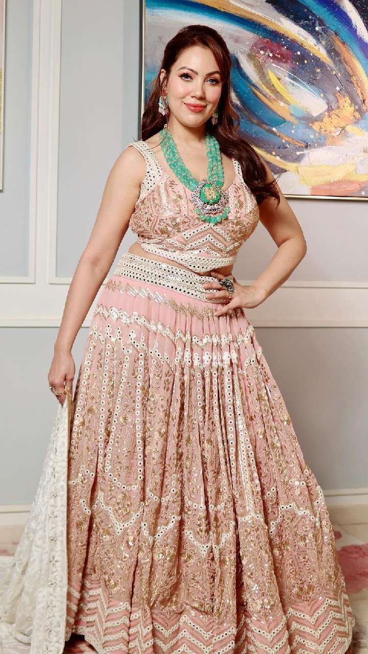 आप मुनमुन दत्ता जैसा हैवी फुल वर्क पिंक लहंगा पहनकर हुस्न की मल्लिका दिखेंगी। यदि आपका यह पहला करवा चौथ है तो आप इसे जरूर ट्राई करें।