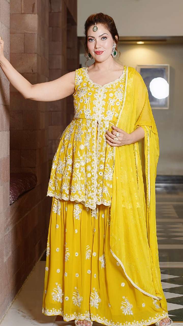 आप करवा चौथ पर बबिता जी के जैसा येलो मिरर वर्क शरारा लहंगा पहनकर खूबसूरत नजर आएंगी। इसमें सूट में आपको देख पति दीवाने हो जाएंगे।