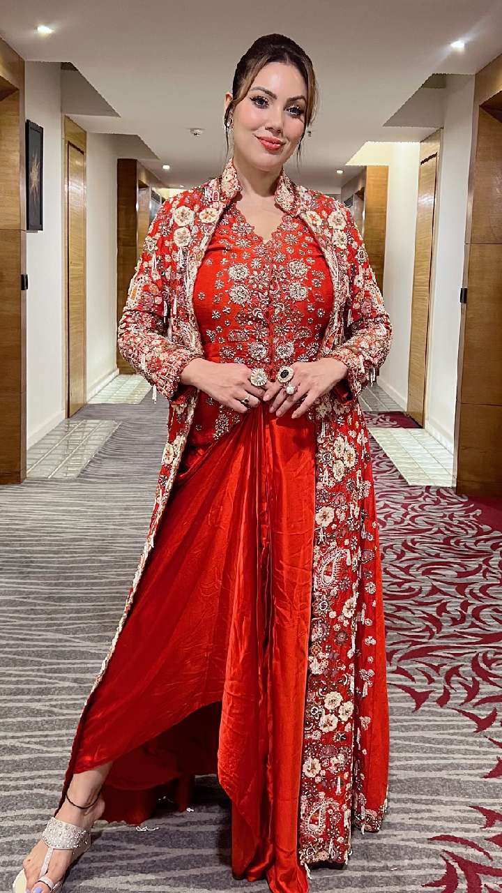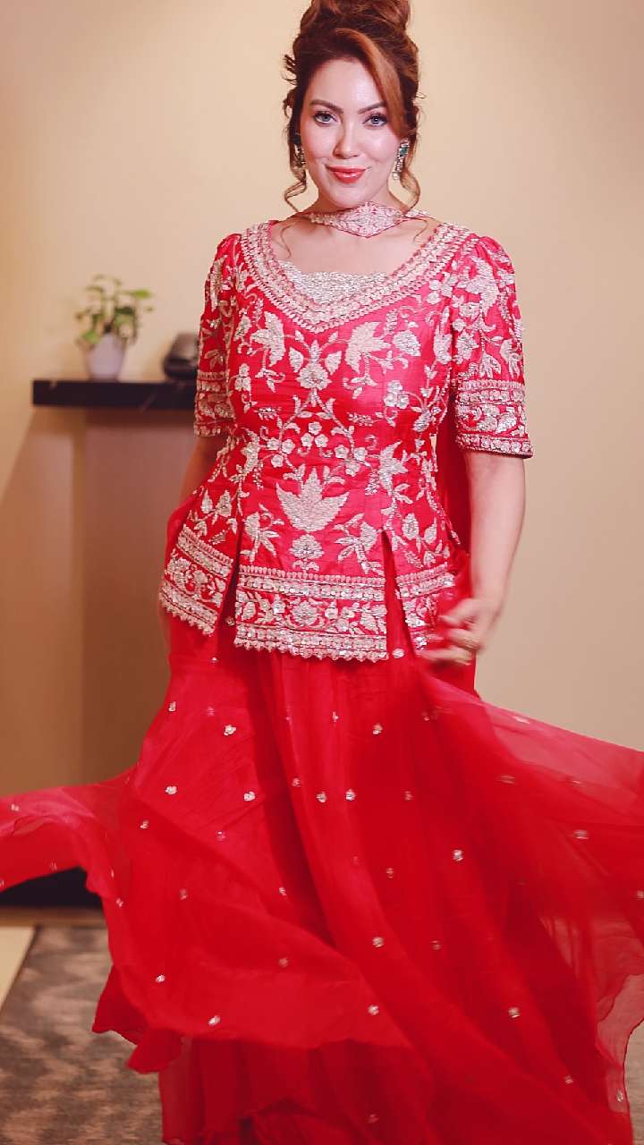 डीवा की रेड धोती स्टाइल साटन स्कर्ट हैवी वर्क लांग चोली के साथ कट दाना वर्क लंबा श्रग ग्लैमरस लुक दे रहा है। इसको पहनकर आप एकदम अप्सरा नजर आएंगी।