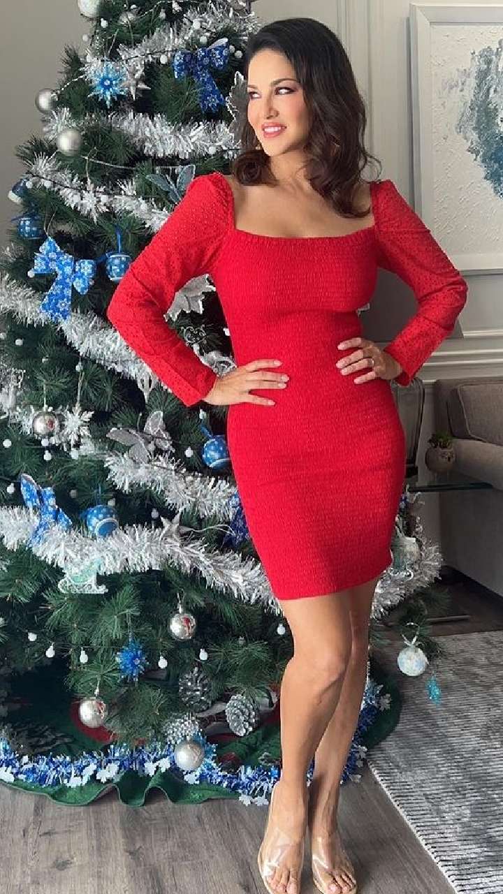 क्रिसमस पर सनी ने रेड कलर की शॉर्ट बॉडीकॉन ड्रेस कैरी की थी। आप भी एक्ट्रेस के लुक को फॉलो कर सकते है।