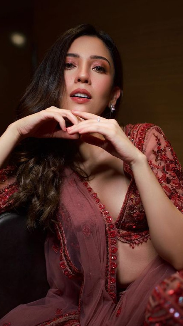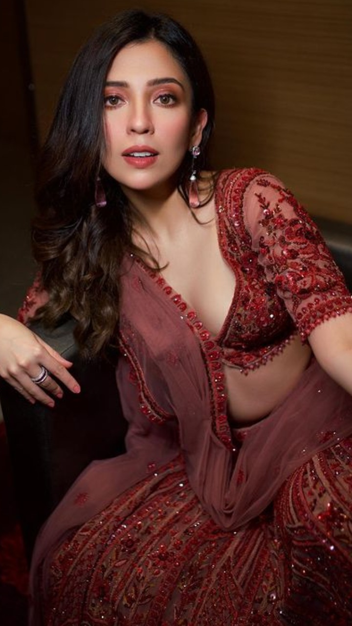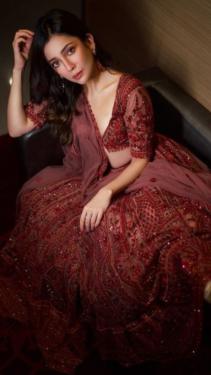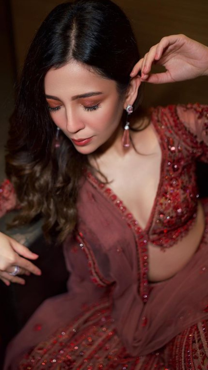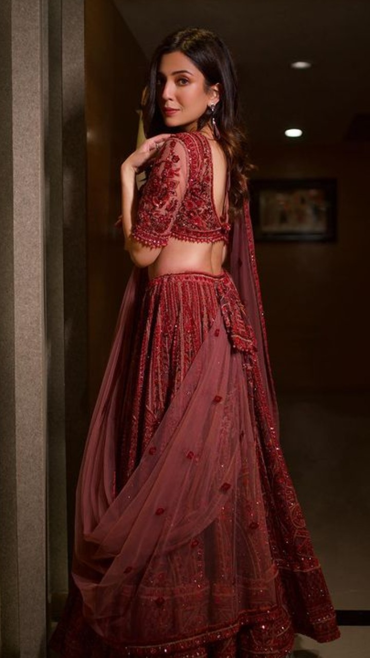 तस्वीर में रॉयल मैरून कलर का एंबेलिश्ड लहंगा और डीप नेक ब्लाउज पहने बरखा काफी खूबसूरत लग रही है।