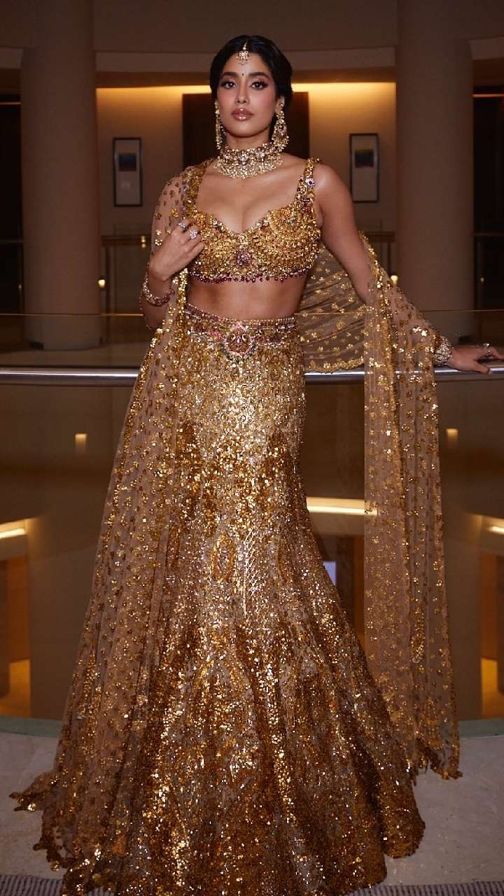 अगर आप शादी में कुछ डिफरेंट और हैवी ट्राई करना चाहती हैं, तो जाह्नवी के इस गोल्डन एंब्रॉयडरी लहंगा को कॉपी करना न भूलें।