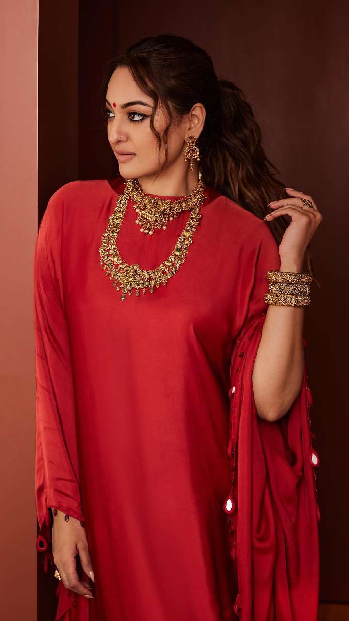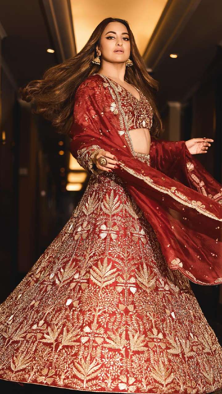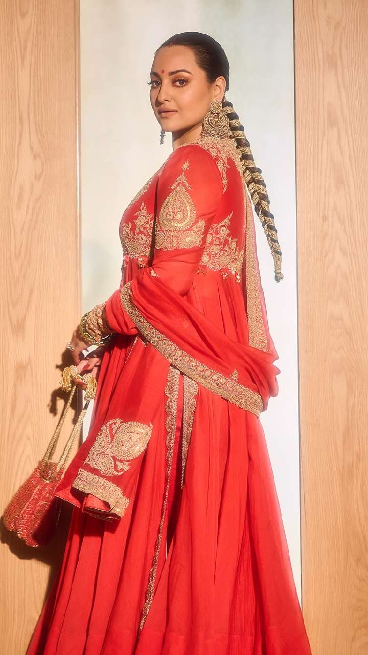 नई दुल्हन स्टाइलिश दिखने के लिए हर आउटफिट पर हाई बन हेयरस्टाइल बनाएं। सोनाक्षी का यह लुक एकदम बेस्ट है।