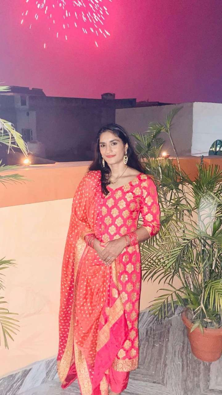 यह फोटो विनेश की दीपावली की है, जो उन्होंने इंस्टाग्राम पर पोस्ट की थी। पिंक सूट में उनका लुक अलग नजर आ रहा है।