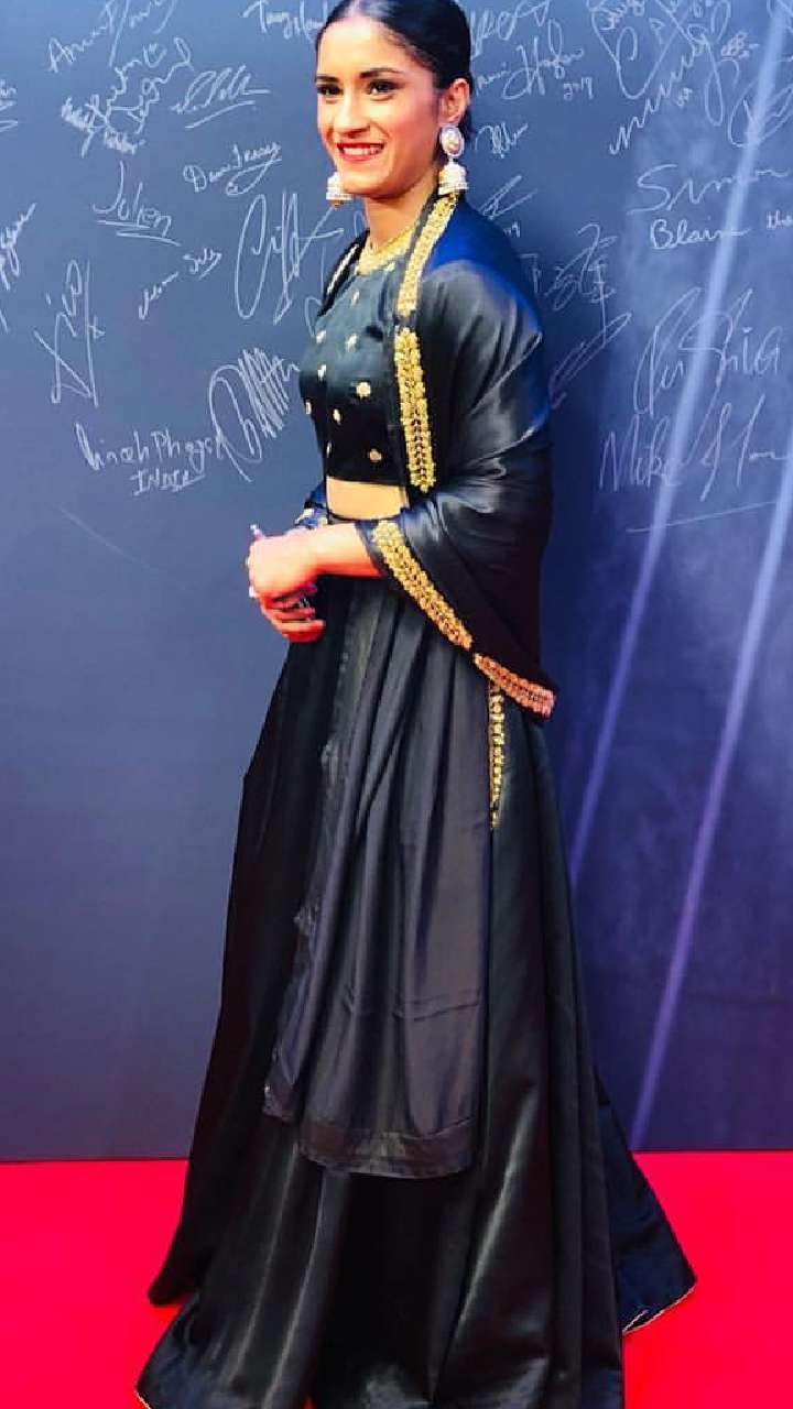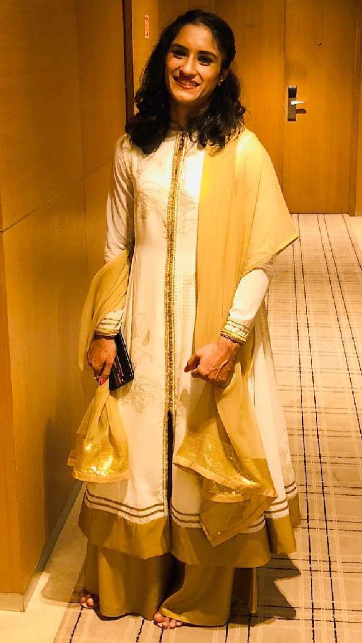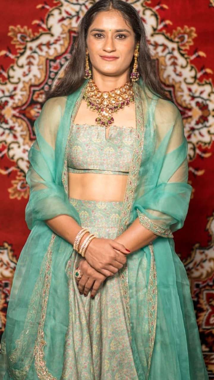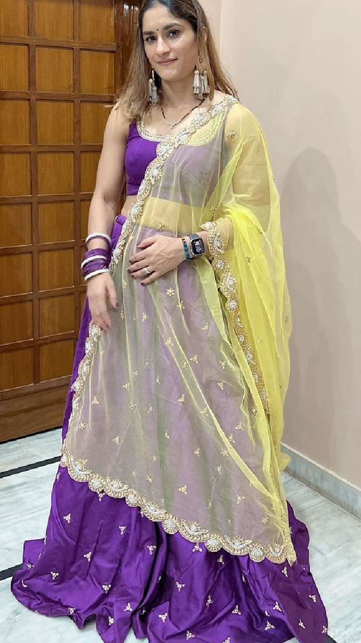 विनेश फोगाट इस तस्वीर में बेहद खूबसूरत नजर आ रही है। पीले और जामनी कलर की यह ड्रेस विनेश पर खूब जच रही है।