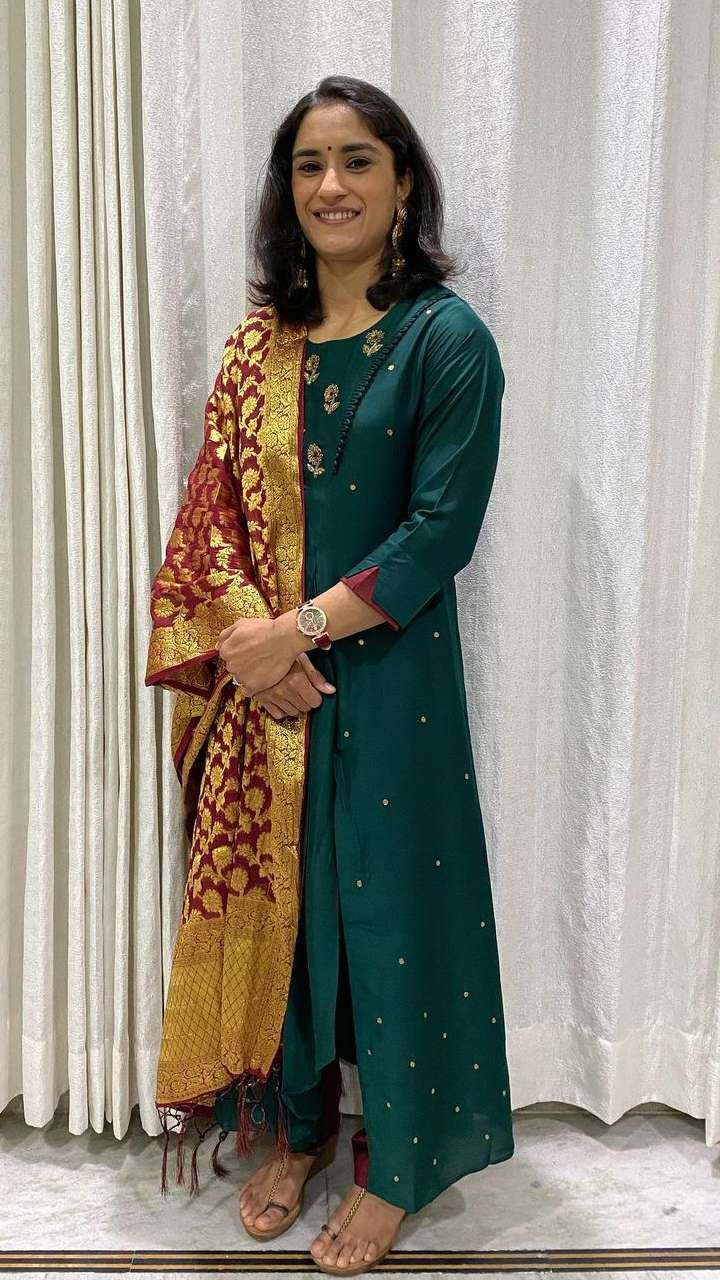 डार्क ग्रीन कलर की ड्रेस में विनेश एक दम हटके लग रही है। उनका यह सादगी वाला लुक फैंस को पसंद आ रहा है।