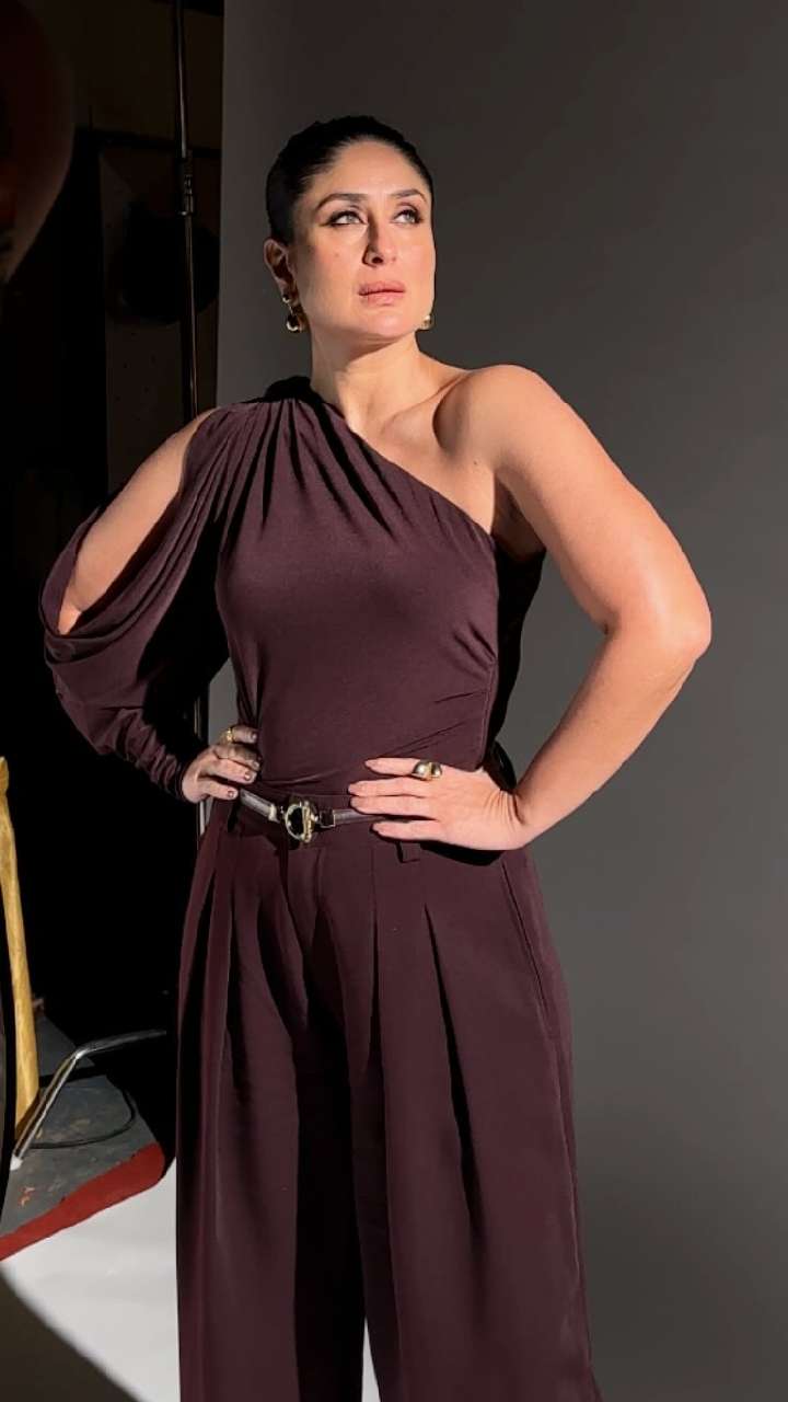 करीना का डार्क चॉकलेटी कलर का वन शोल्डर चॉकलेटी जंपसूट बेहद स्टाइलिश लग रहा है। ये आपके ऑफिस इवेंट के लिए बेस्ट रहेगा।