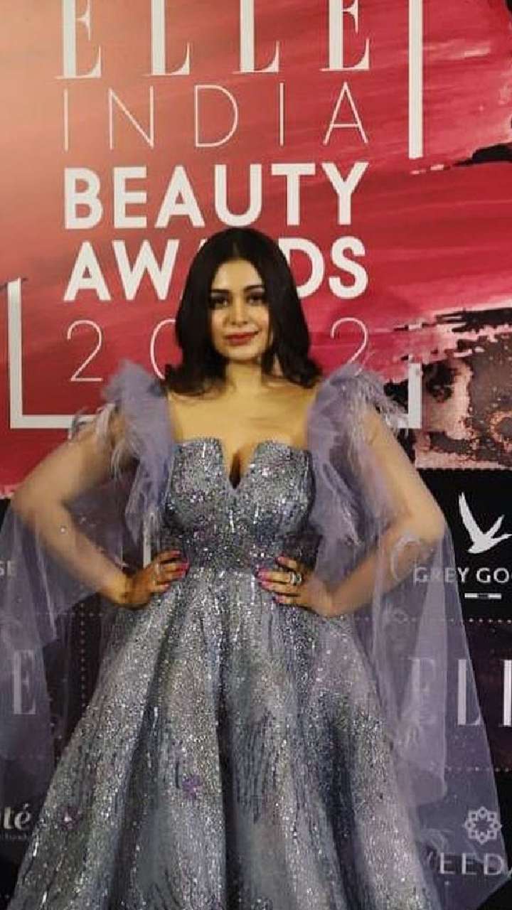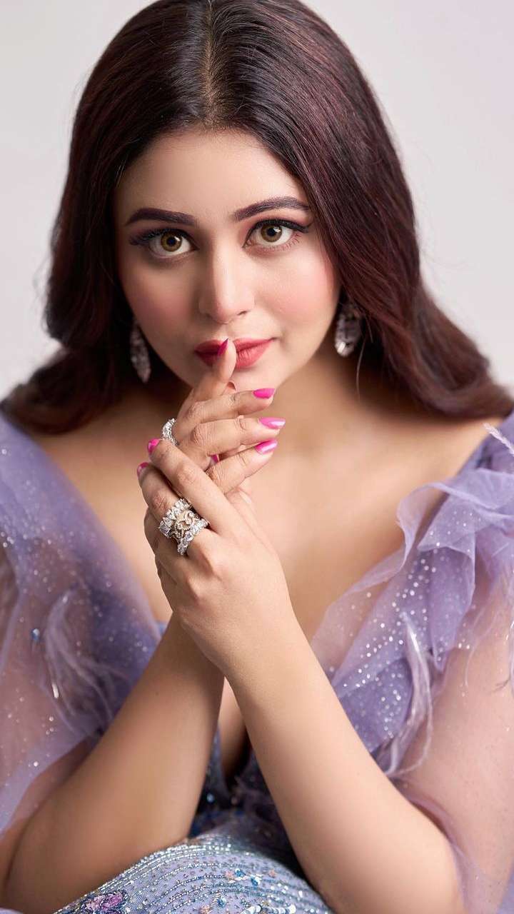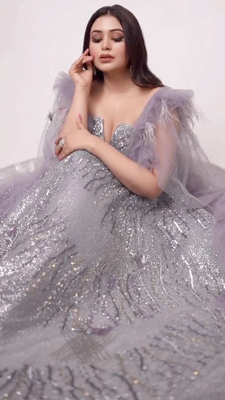 तस्वीर में एक्ट्रेस ने पर्पल कलर का वी-नेक फ्रिल गाउन पहना हुआ हैं।