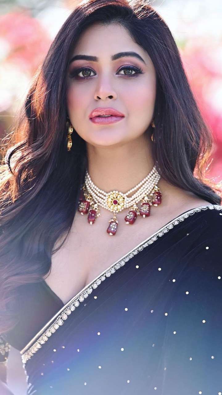 रीताभरी ने तस्वीर में ब्लैक कलर की साड़ी, बैकलेस ब्लाउज और आर्टिफिशियल ज्वेलरी पहनी हुई हैं।