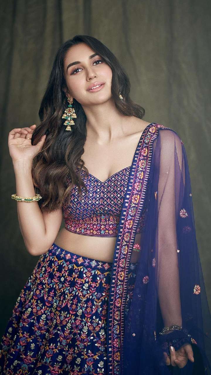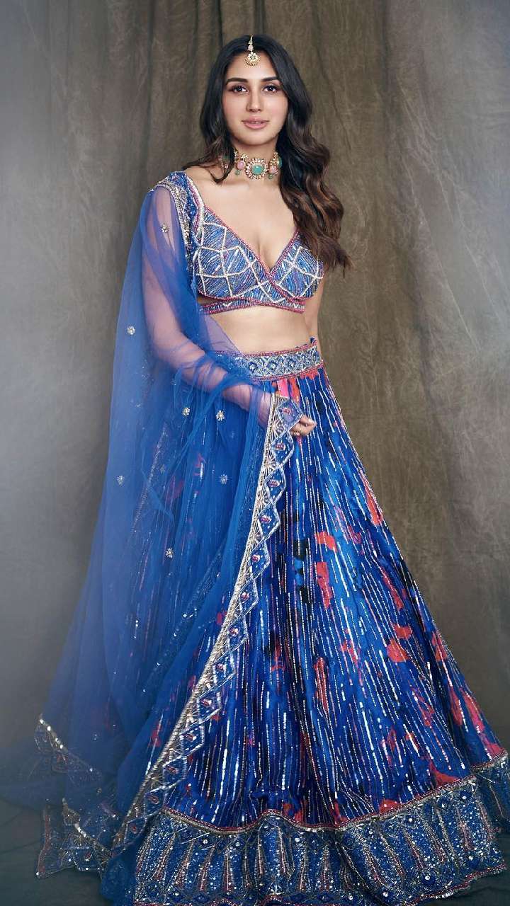 ब्लू कलर के प्रिंटेड सेक्विन लेयर लहंगे डीपनैक चोली में आप भी एक्ट्रेस की तरह आग लगा सकती हैं। इसके साथ मैचिंग कलर स्टोन चोकर नेकपीस और मांग टीका पेयर किया है।