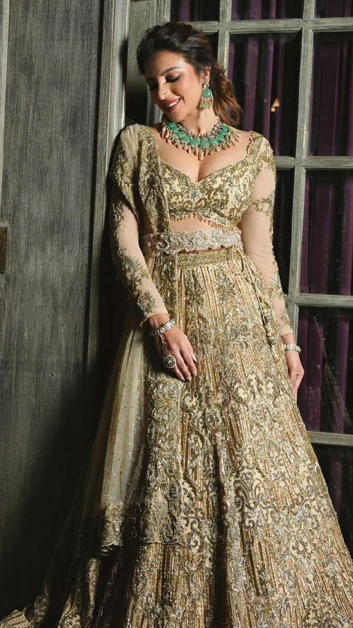 वेडिंग सीजन में हैवी बॉडी वाली लड़कियां इस तरह के फुल वर्क गोल्डन लहंगे ब्रॉड नेक चोली से अपने लुक में आग लगा सकती हैं।
