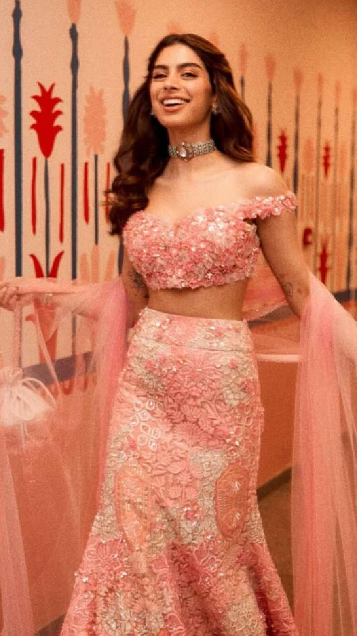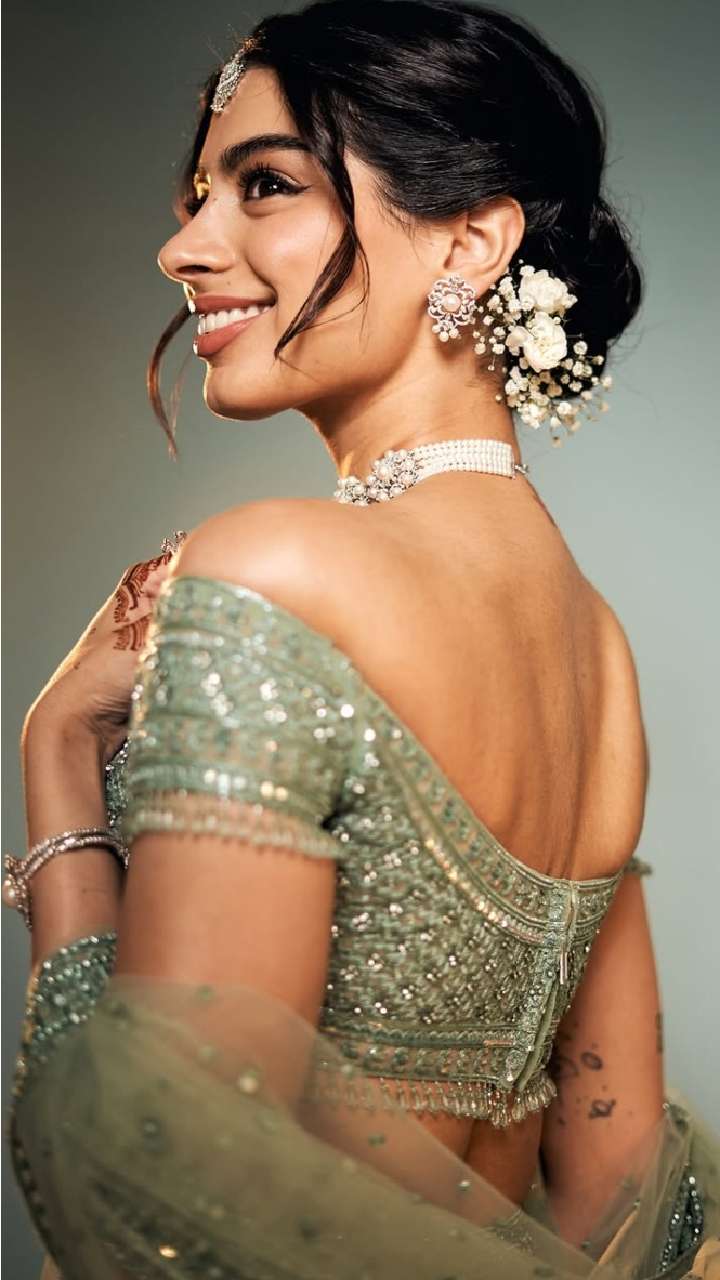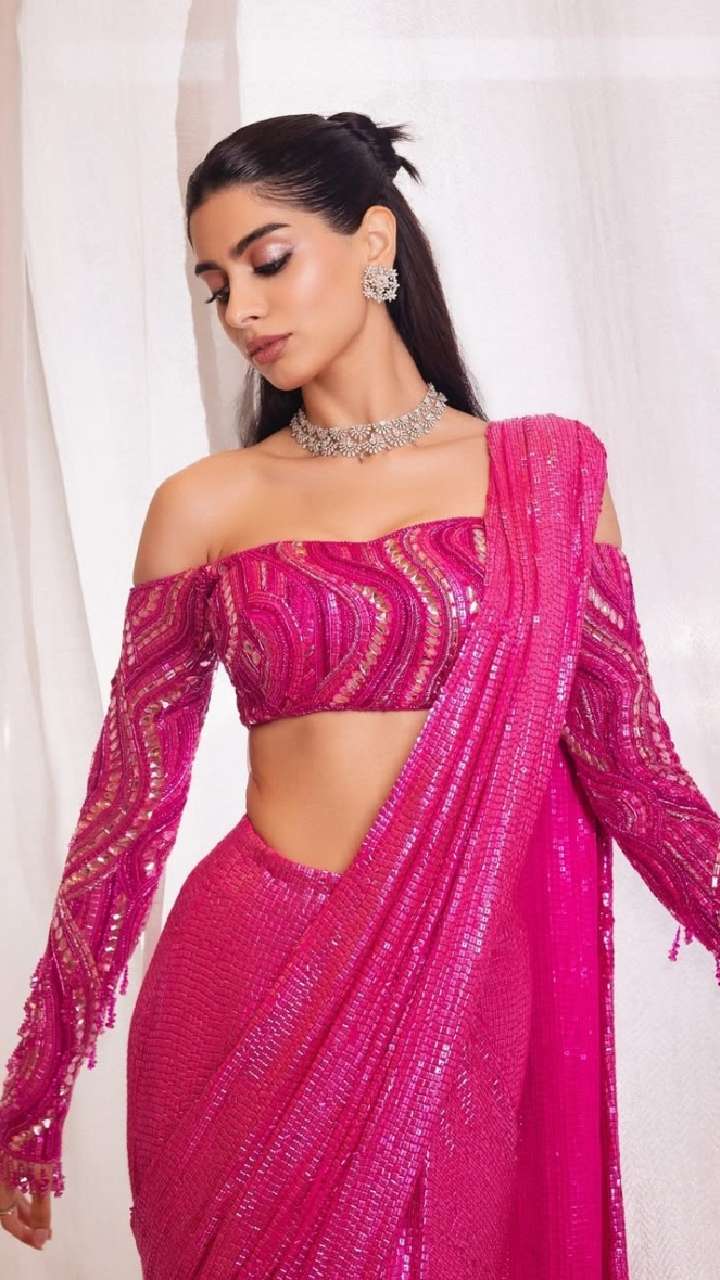 खुशी कपूर का यह ब्लाउज इस सीक्वेंस साड़ी के साथ काफी ज्यादा सूट के रहा है। इसके साथ उन्होंने डबल लेयर चोकर, टॉप्स और हॉफ ओपन हेयर बनाए हैं।