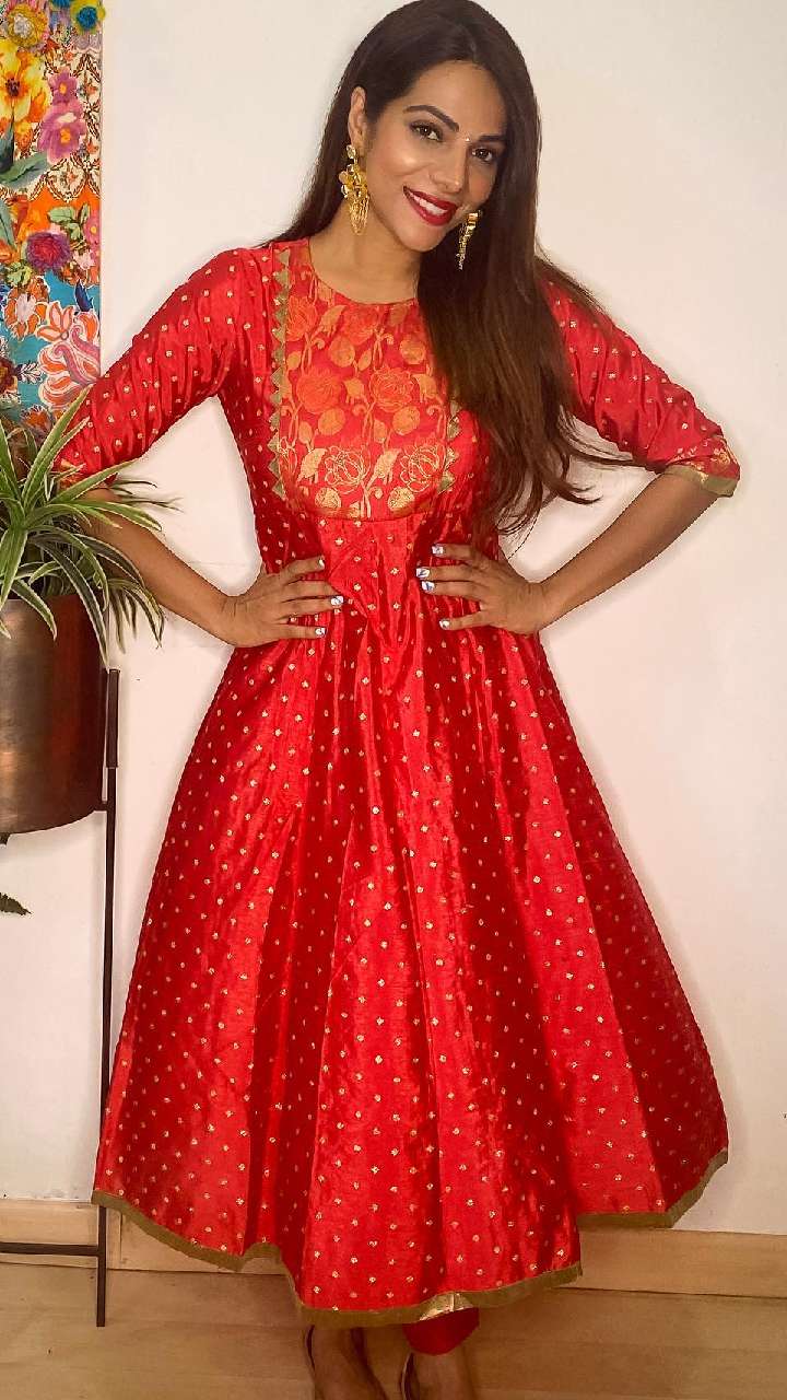 दशहरा और दुर्गा पूजा दोनों में लाल रंग पहनना शुभ होता है। ऐसे में आप भी डीवा के सिल्क अनारकली सूट को कॉपी कर सकती हैं।