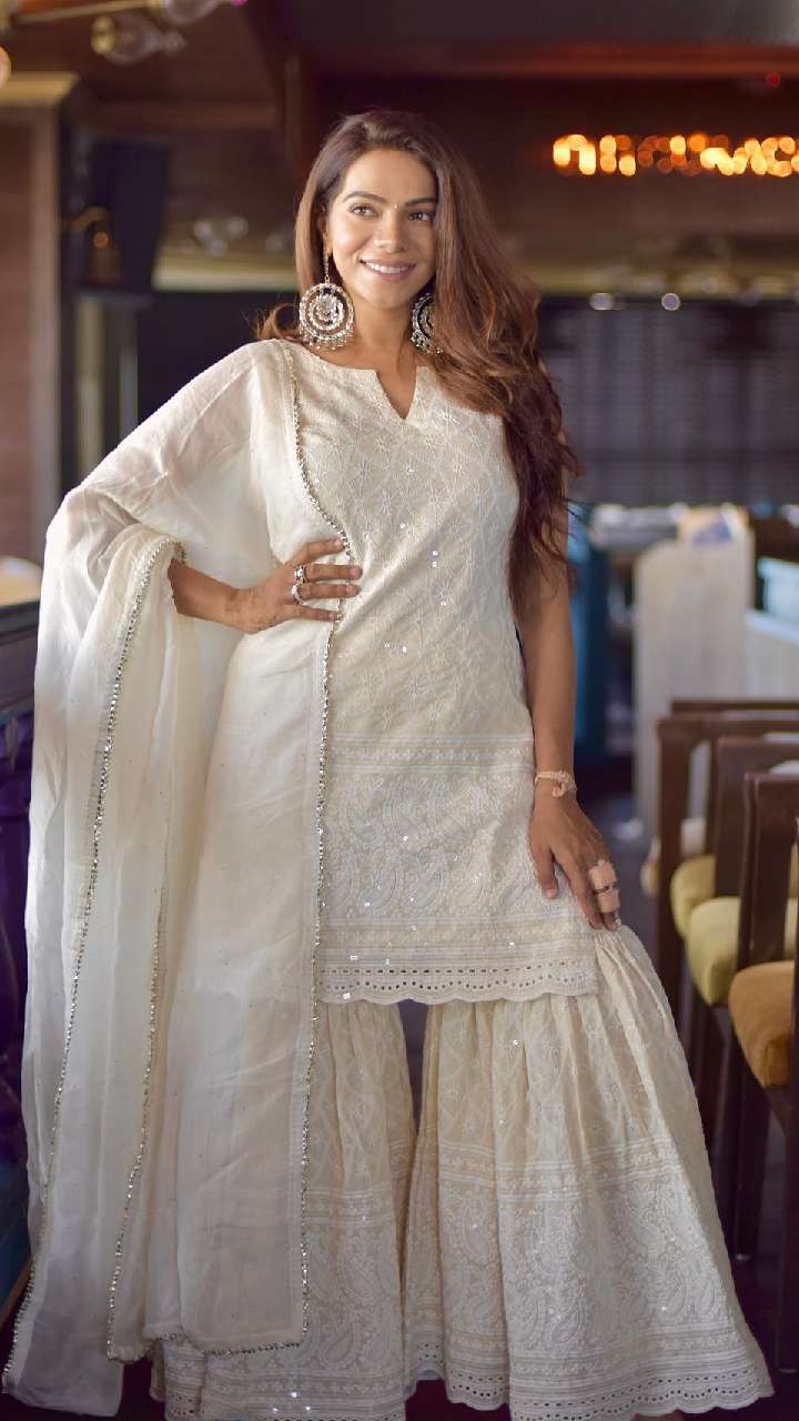 दुर्गा पूजा के लिए डीवा के जैसा व्हाइट चिकनकारी शरारा सूट बेस्ट रहेगा। ये आपके लुक को एकदम ट्रेडिशनल लुक देगा। इसके संग आप भी कुंदन झुमके पहन सकती हैं।