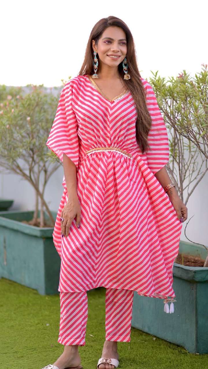 आप दशहरा पूजा में इस तरह का काफ्तान स्टाइल लहरिया प्रिंट सूट भी ट्राई कर सकती हैं। ये आपको यूनिक और अट्रैक्टिव लुक देगा।