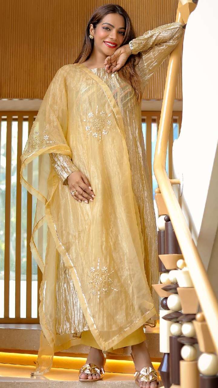 अभिनेत्री गोल्डन कलर के ए लाइन सूट में काफी ब्यूटीफुल लग रही हैं। इसके संग उनका नेटिड दुपट्टा जंच रहा है। आप इसे दशहरा पूजा में पहन सकती हैं।