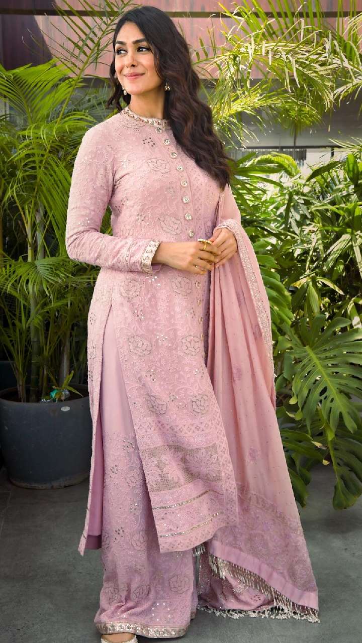 लाइट पिंक कलर के शरारा पैटर्न सूट डिजाइन में मृणाल ठाकुर का लुक काफी शानदार लग रहा है। आप भी लाइट कलर के सूट को स्टाइल कर सकती हैं।