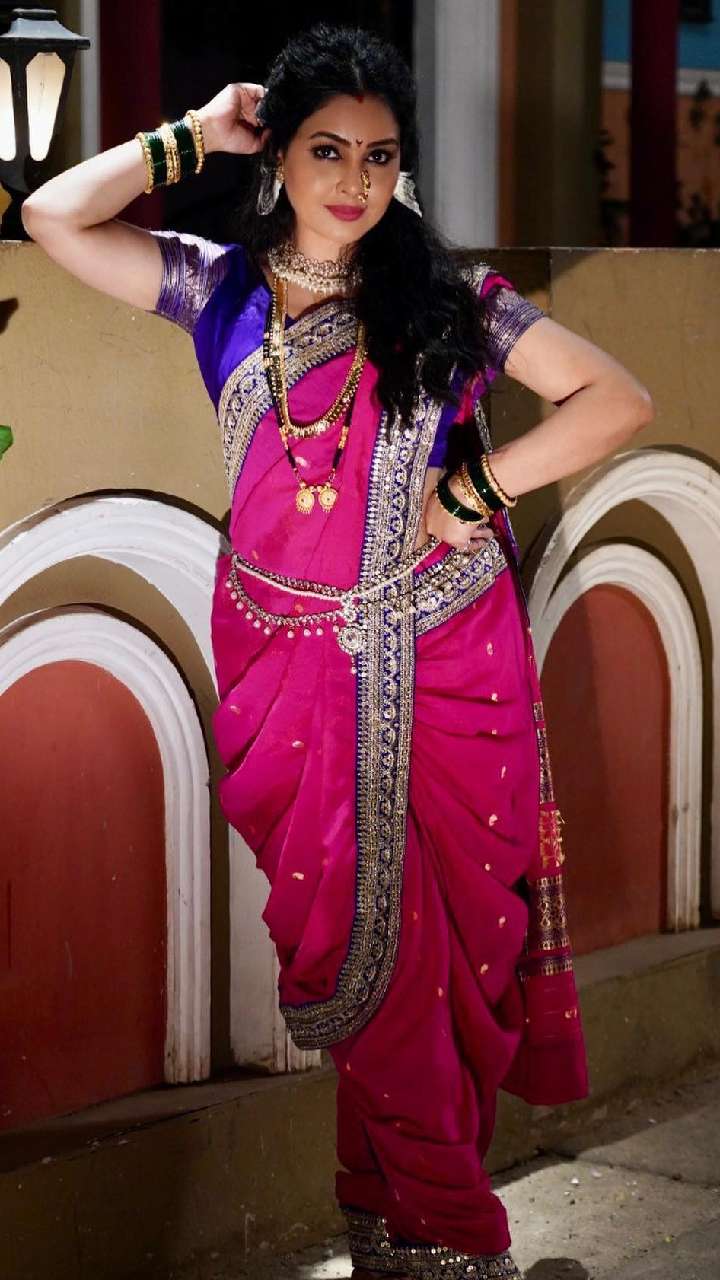 इस पिंक कलर की ब्लू बॉर्डर साड़ी में आप एक्ट्रेस का मराठी मुलगी लुक देख सकते हैं।