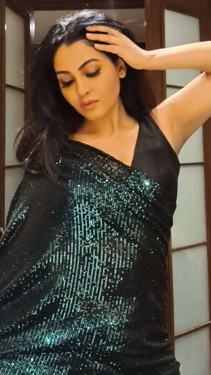 इस ग्रीन कलर की सेक्विन साड़ी कट स्लीव्स ब्लाउज में आप शुभांगी की किलर अदाएं देख सकते हैं।