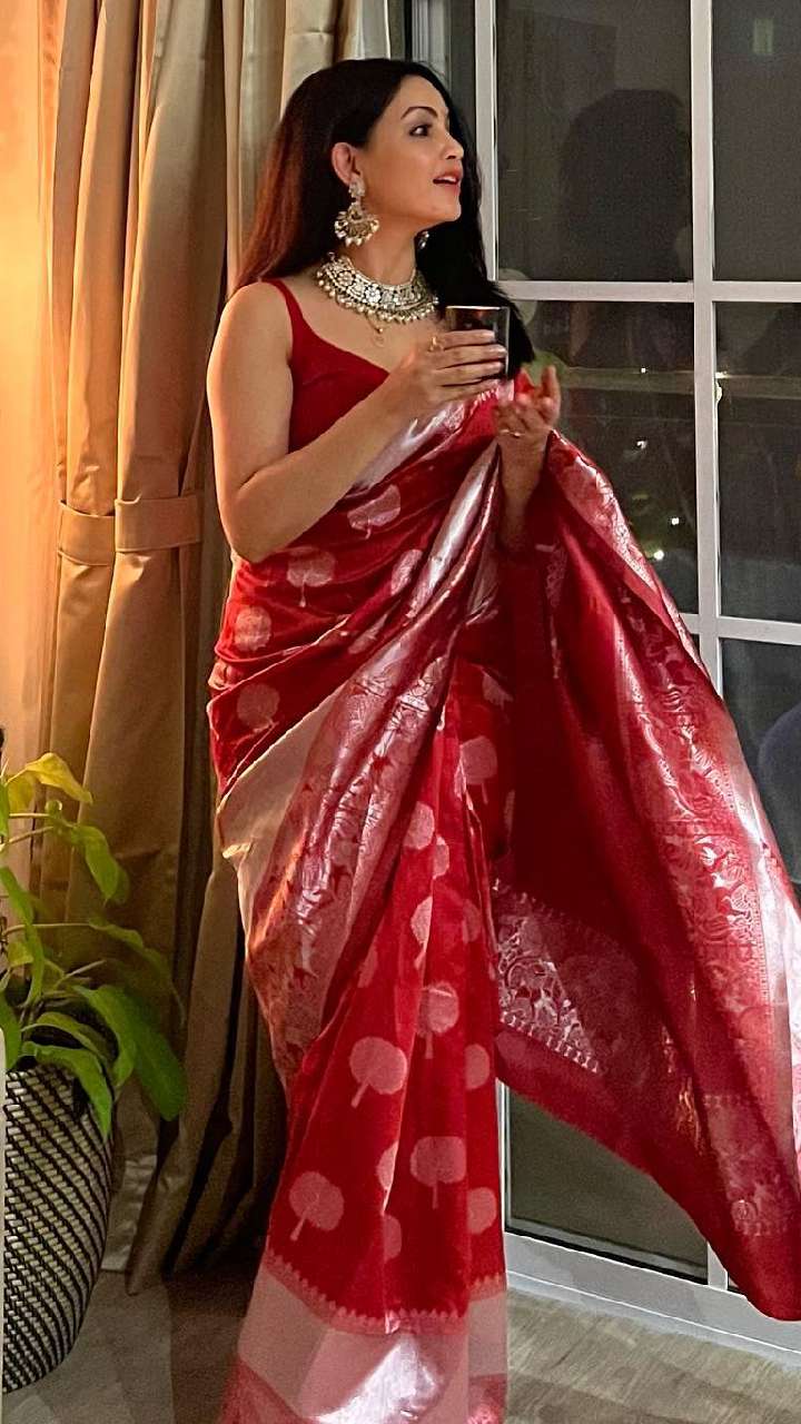 इस रेड कलर की सिल्क साड़ी में शुभांगी एकदम ट्रेडिशनल लुक दे रही हैं। वेडिंग के लिए आप इस लुक से आइडिया ले सकती हैं।