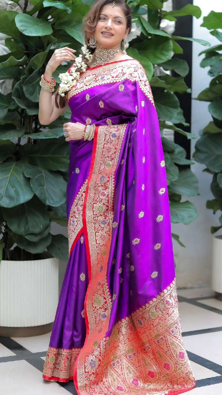 भाग्यश्री पर्पल कर की कांजीवरम साड़ी में काफी गॉर्जियस लग रही हैं। इस तरह की साड़ी हर मौके पर खास लुक देती हैं। आप भी उनकी ये साड़ी से इंस्पिरेशन ले सकती हैं।