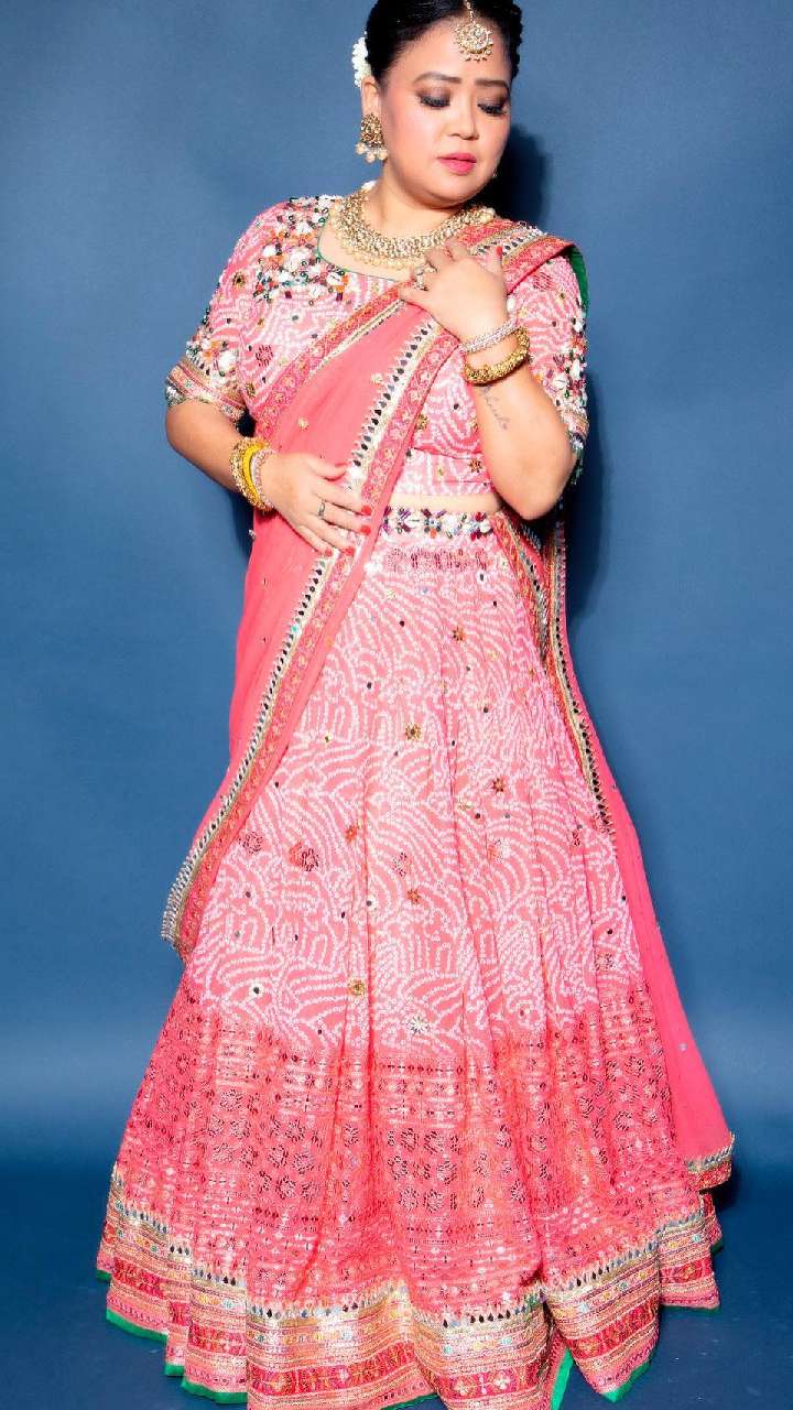 आप भारती सिंह के इस पिंक लहंगे को भी कैरी कर सकती हैं। भारती सिंह का ये पूरा लुक ही शानदार है।