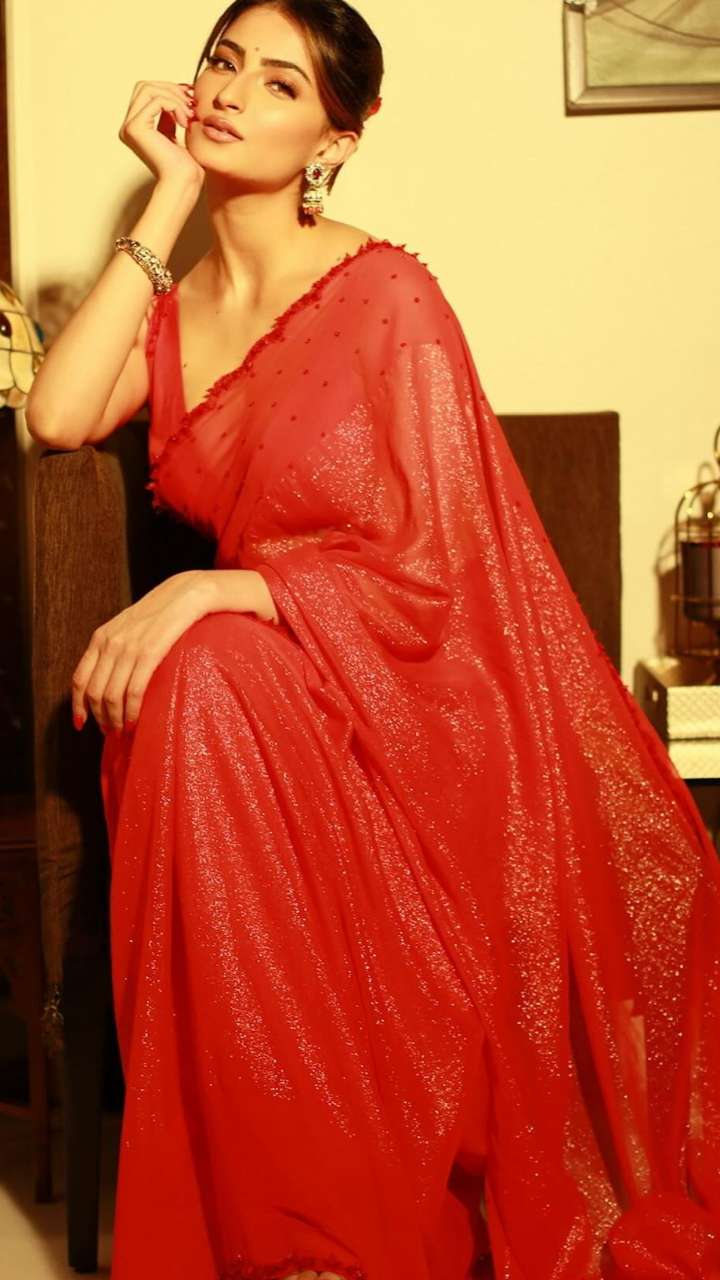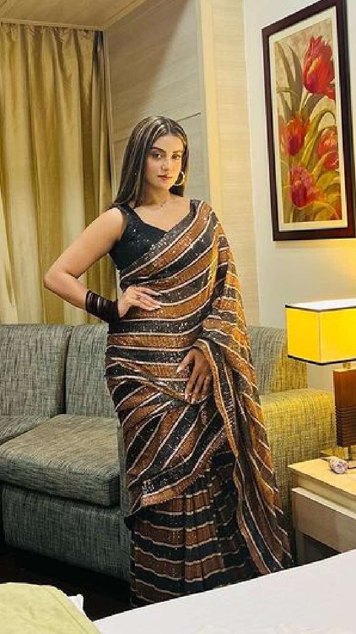 एक्ट्रेस शिमरी साड़ी और ब्लैक ब्लाउज पहने गॉर्जियस दिख रही हैं।