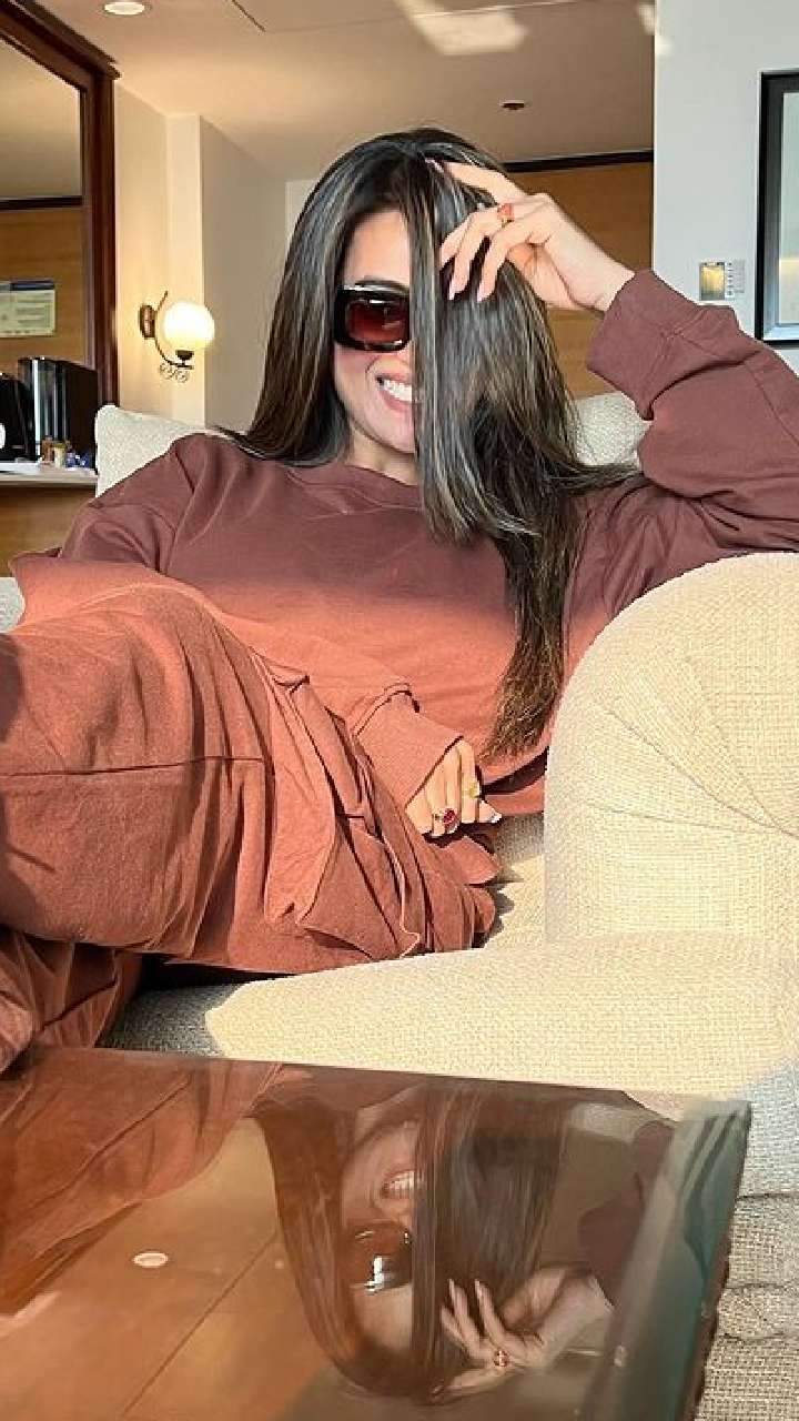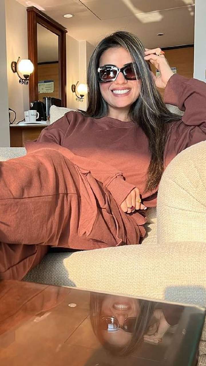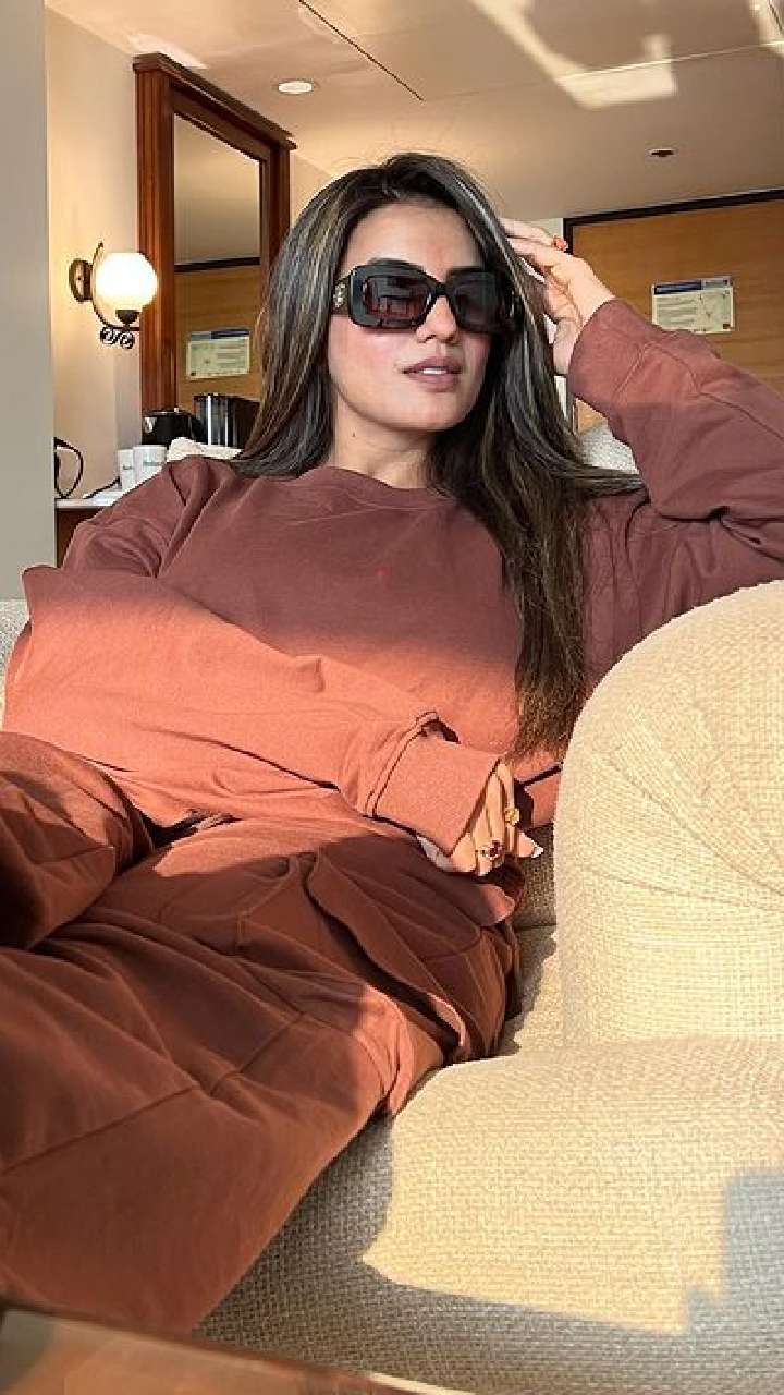 इसके साथ ही ब्राउन आउटफिट संग ब्लैक ग्लासिस में भोजपुरी क्वीन का स्टाइलिश लुक देखा जा सकता है।