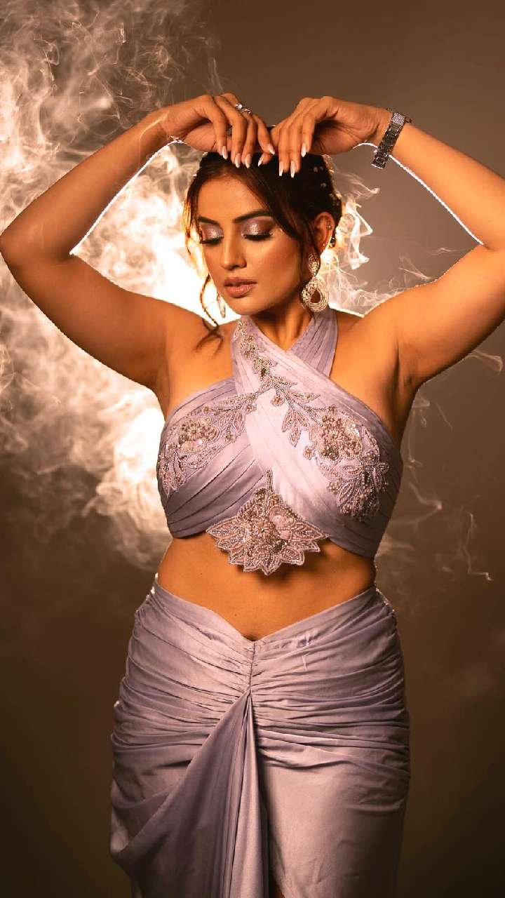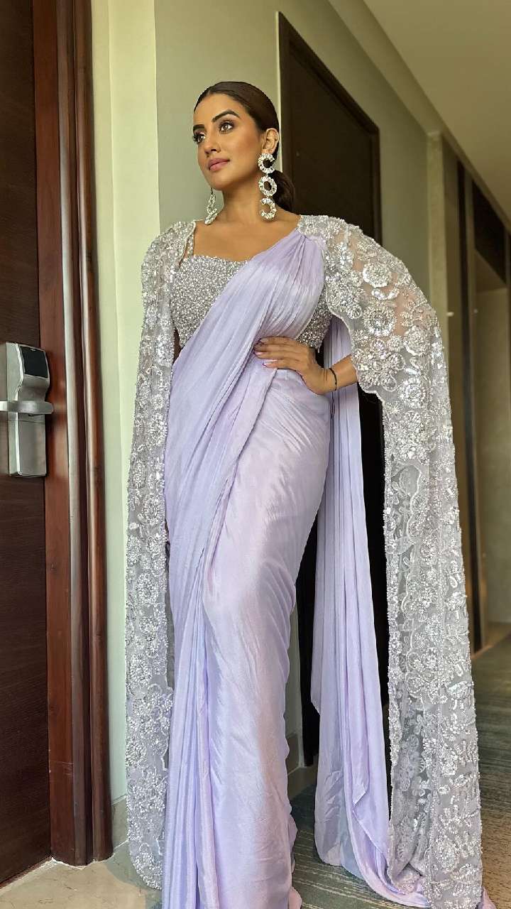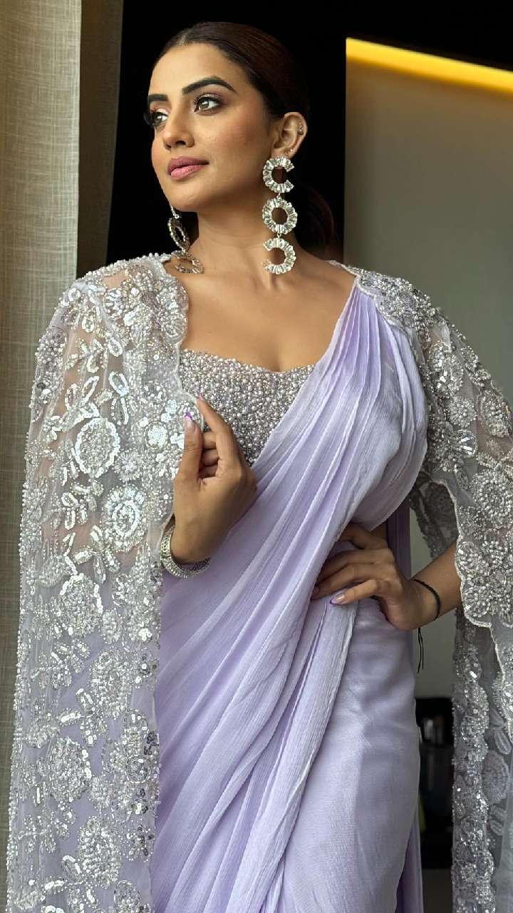 एक्ट्रेस ने हाल में लेवेंडर कलर की प्लेन साटन साड़ी हैवी वर्क सिल्वर ब्लाउज के साथ लांग नेटिड वर्क वाला लांग श्रग कैरी किया हुआ है। जो काफी स्मार्ट लुक दे रहा है।