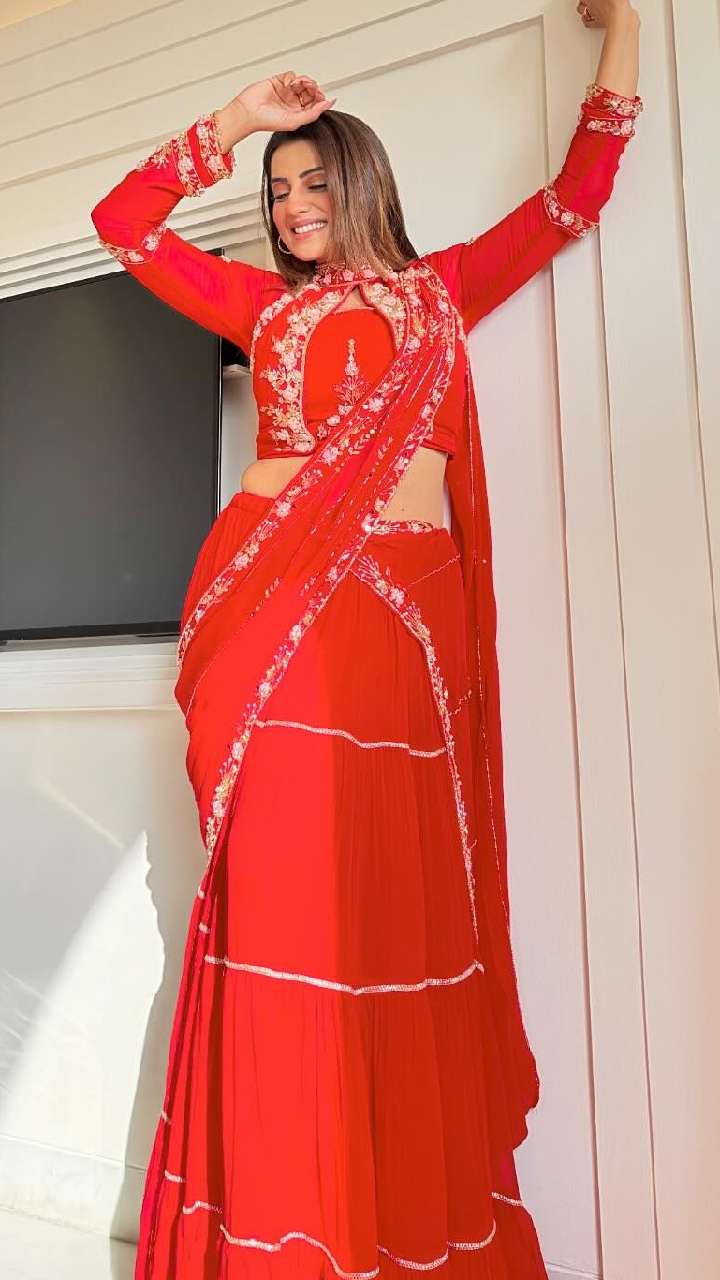 आजकल इस तरह की लहंगा साड़ियां भी काफी फैशन में हैं। ऐसे में आप अभिनेत्री की रेड विद आउट प्लेट्स लहंगा साड़ी बोल्ड ब्लाउज को पेयर कर सकती हैं।
